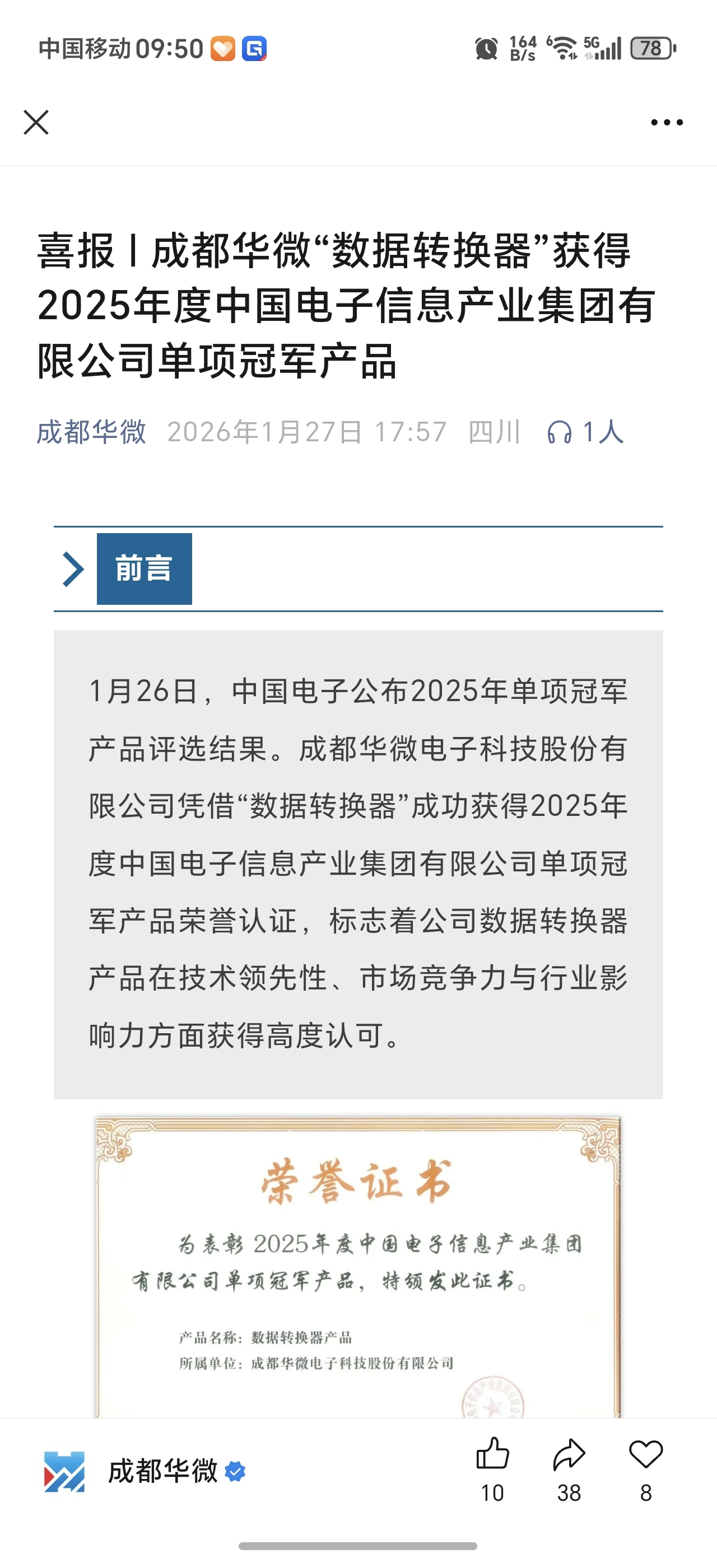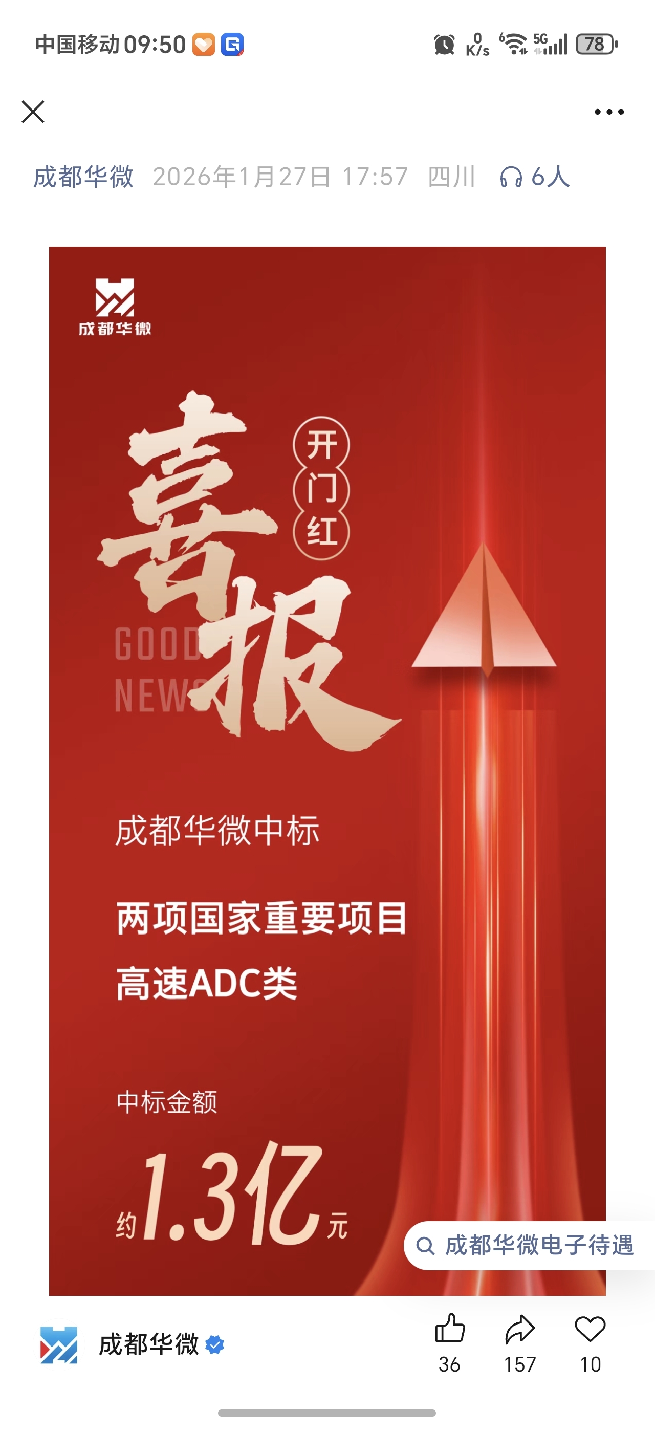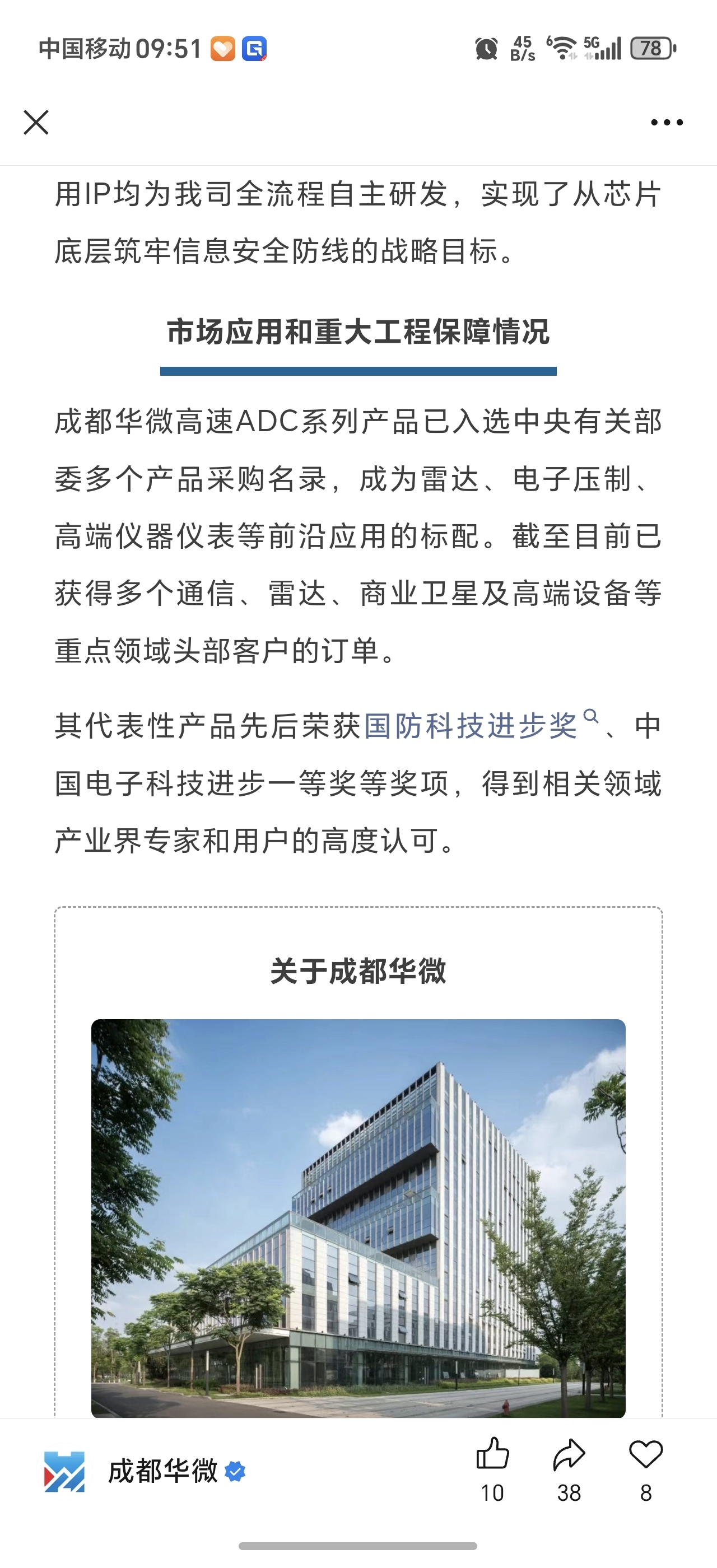 $成都华微(SH688709)$ $臻镭科技(SH688270)$ $电科芯片(SH600877)$ 成都华微公众号发布公司的ADC(高速高精度模数转换器)芯片产品成功中标1.3亿元两项国家重要项目,根据年报业绩预告的表现来看成都华微更有可能供货中国星网,因为从芯片的技术水平上来讲,成都华微的12位40 gADC芯片远超真雷科技的14位4 gADC芯片的性能,成都华为在高精度方面差了两位,但是在高速度方面却是臻镭的10倍,看年报业绩预告臻镭科技有可能只是给中国星网供货的电源芯片!
