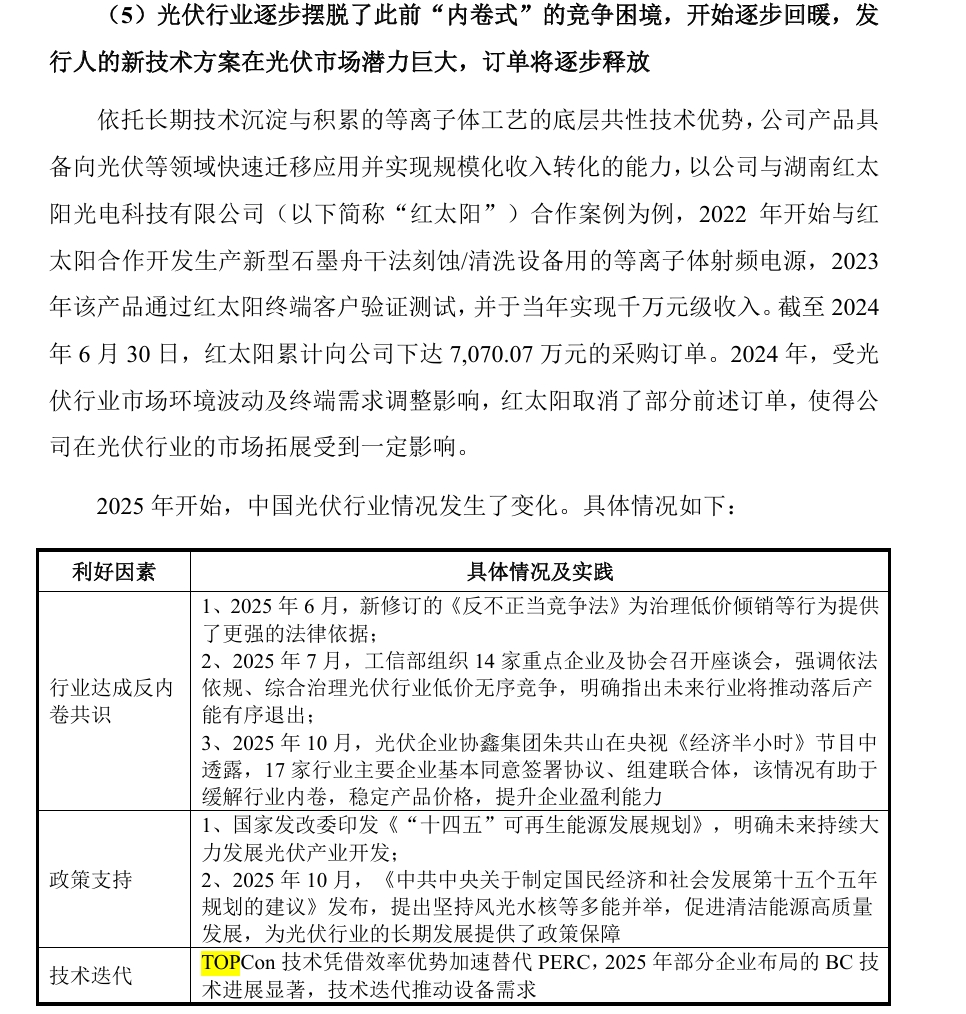 2.光伏行业逐步摆脱了此前“内卷式”的竞争困境,开始逐步回暖,发行人的新技术方案在光伏市场潜力巨大,订单将逐步释放 依托长期技术沉淀与积累的等离子体工艺的底层共性技术优势,公司产品具备向光伏等领域快速迁移应用并实现规模化收入转化的能力,以公司与湖南红太阳光电科技有限公司(以下简称“红太阳”)合作案例为例,2022 年开始与红太阳合作开发生产新型石墨舟干法刻蚀/清洗设备用的等离子体射频电源,2023年该产品通过红太阳终端客户验证测试,并于当年实现千万元级收入。截至2024年6月30日,红太阳累计向公司下达7,070.07万元的采购订单。