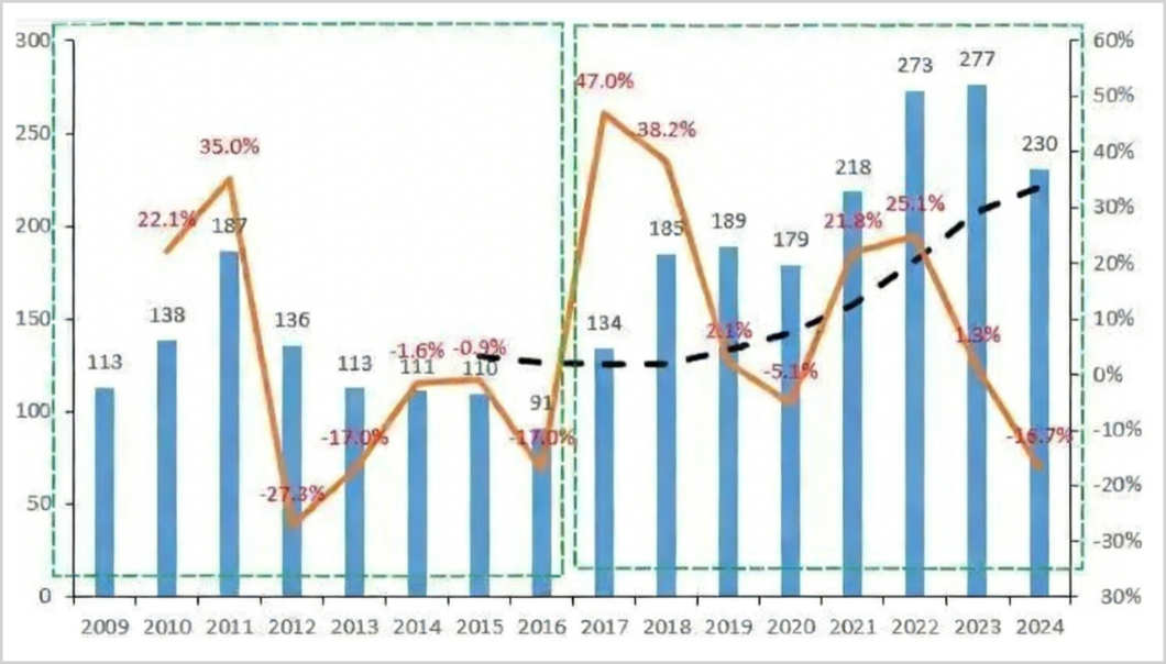 随后两年,行业竞争加剧,企业资本开支开始收缩,2024年甚至下降了16.7%。这使得当年的产能扩张幅度成为近十年来第三低的水平,2025年新增产能继续呈现下降趋势。