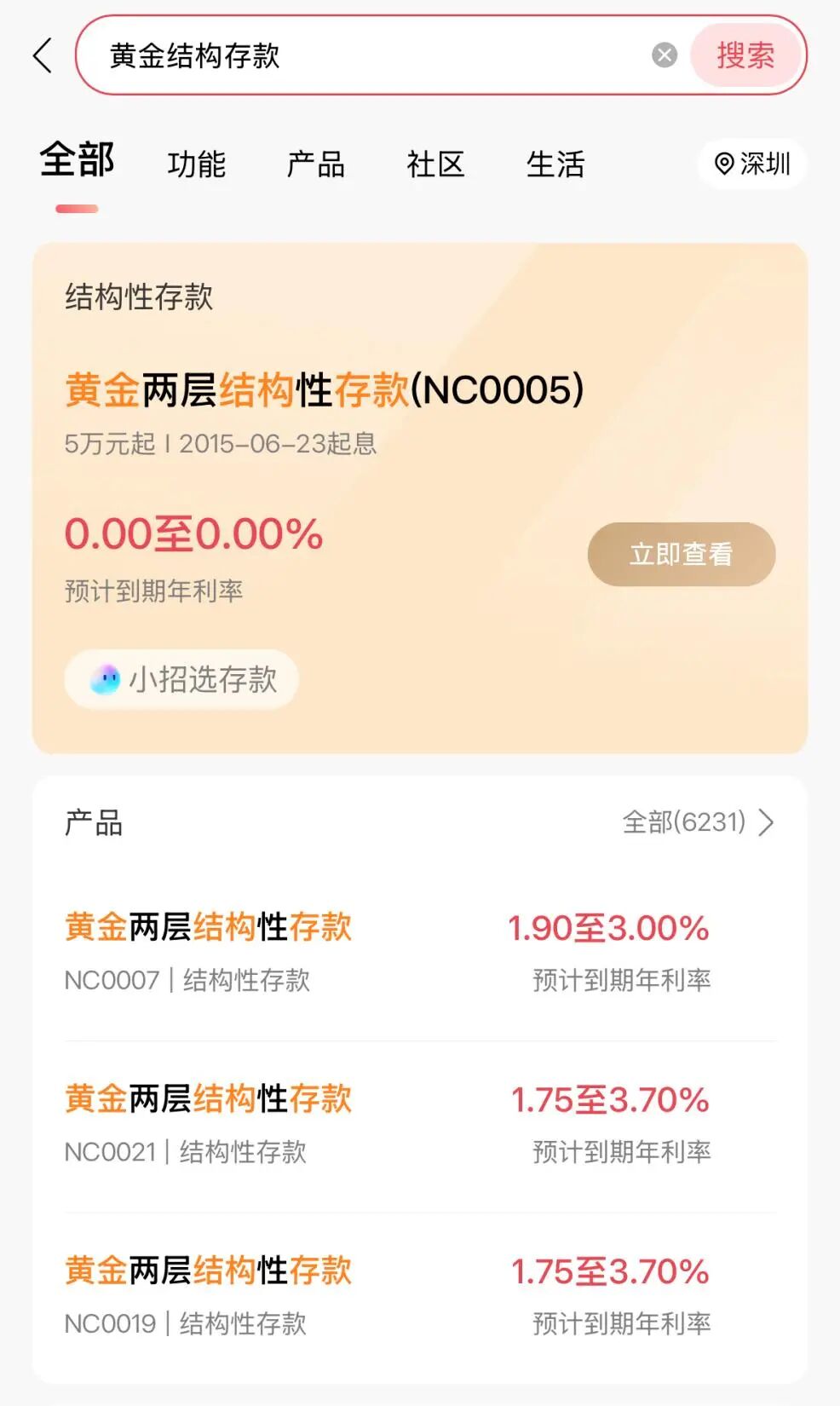记者查阅招商银行App发现,该行在售的黄金挂钩的结构性存款数量繁多,普遍期限在1年以内,预期年化收益区间为1.15%—4.35%。例如,该行推出的“黄金两层12M存款”显示其预期到期年利率为1.75%—4.35%,持有期限为365天,风险等级为R1,5万元起购。