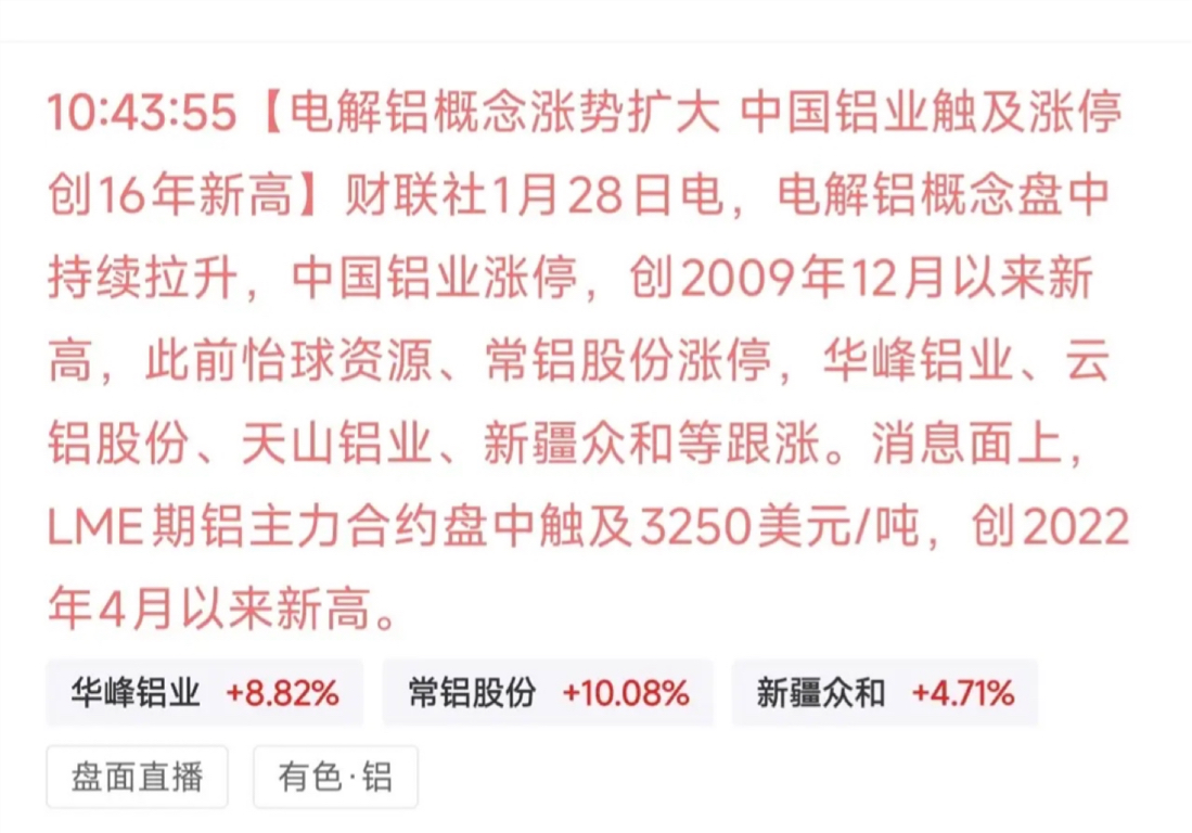 今天(1月28日),受LME期铝主力合约盘中触及3250美元/吨、创2022年4月以来新高的利好刺激,A股电解铝概念板块盘中持续拉升,板块内多股异动走强。其中中国铝业涨停,股价创2009年12月以来16年新高,怡球资源、常铝股份率先涨停,华峰铝业、云铝股份、天山铝业、新疆众和等个股跟涨,板块热度快速升温。