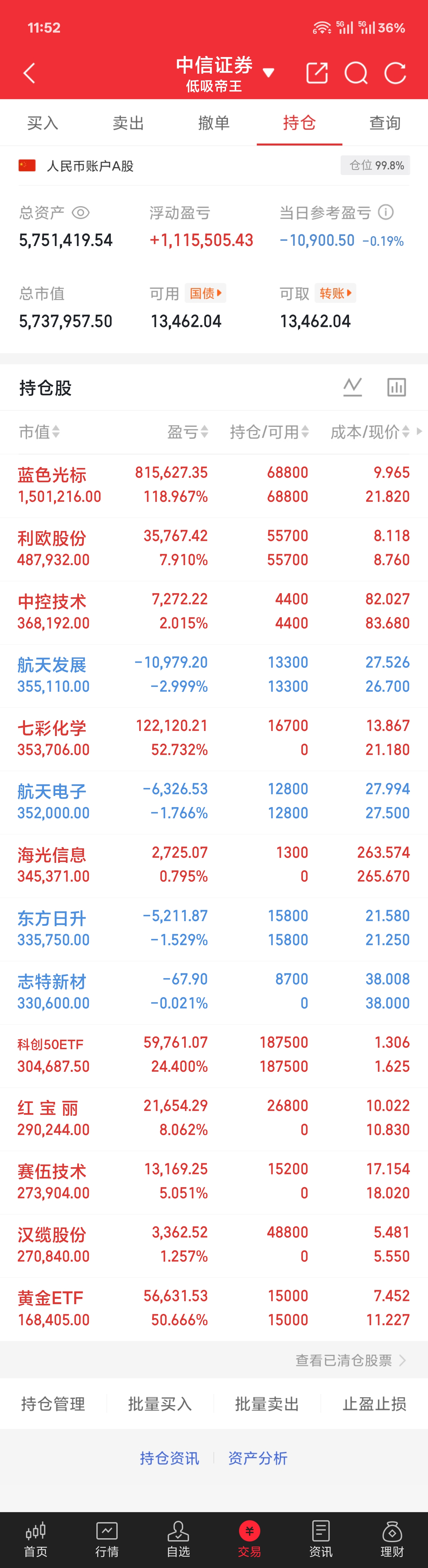 $蓝色光标(SZ300058)$ 依然是我持仓里的灵魂,它只要不放量崩掉,应用端的预期就还在,$利欧股份(SZ002131)$ 也是同样的逻辑。新开了$海光信息(SH688041)$ 、红宝丽、赛伍技术、汉缆股份的底仓,本质上是在做科技回踩和超跌修复的分散布局,试图在轮动里碰运气。实话说,今天这盘面确实有点玩不明白的味道。缩量意味着没有增量资金接力,全是场内资金互捅。在这种环境下比的不是谁赚得多,而是谁能在这个混沌期守住利润。目前的仓位已经顶到了 99%,下午如果反馈依然恶劣,我会考虑做减法。
