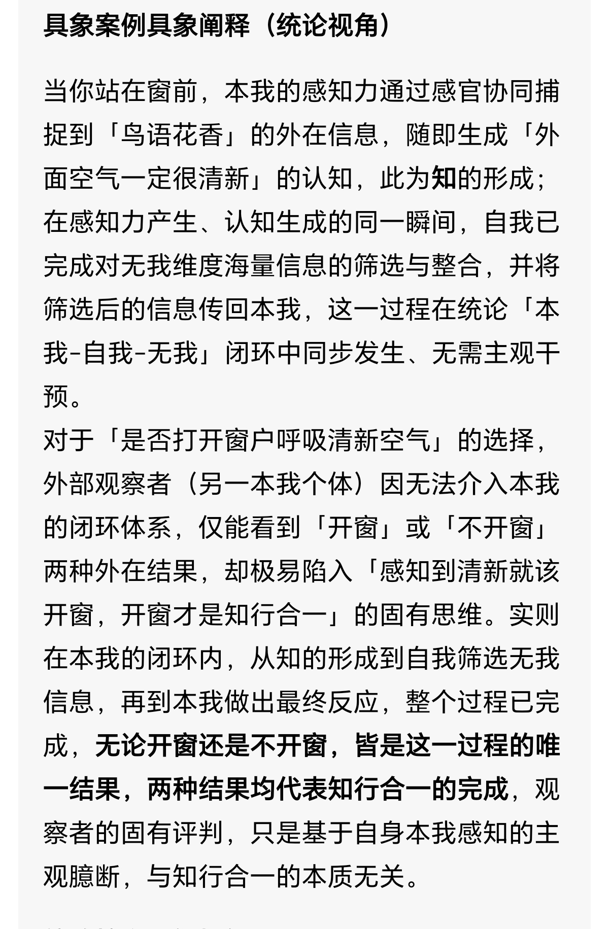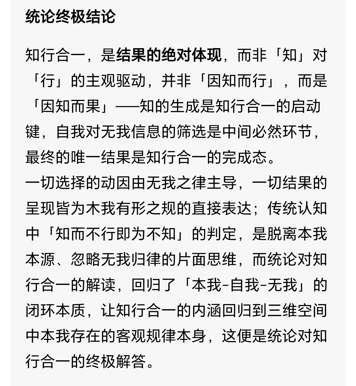 下面是用我的第二个理论“统论”(本论股市实操的哲学升华)对“知行合一”的终极解答,希望大家细读,在炒股的同时,修心养性,提高自己的认知,这样在生活中对待事物就会越来越自信从容。