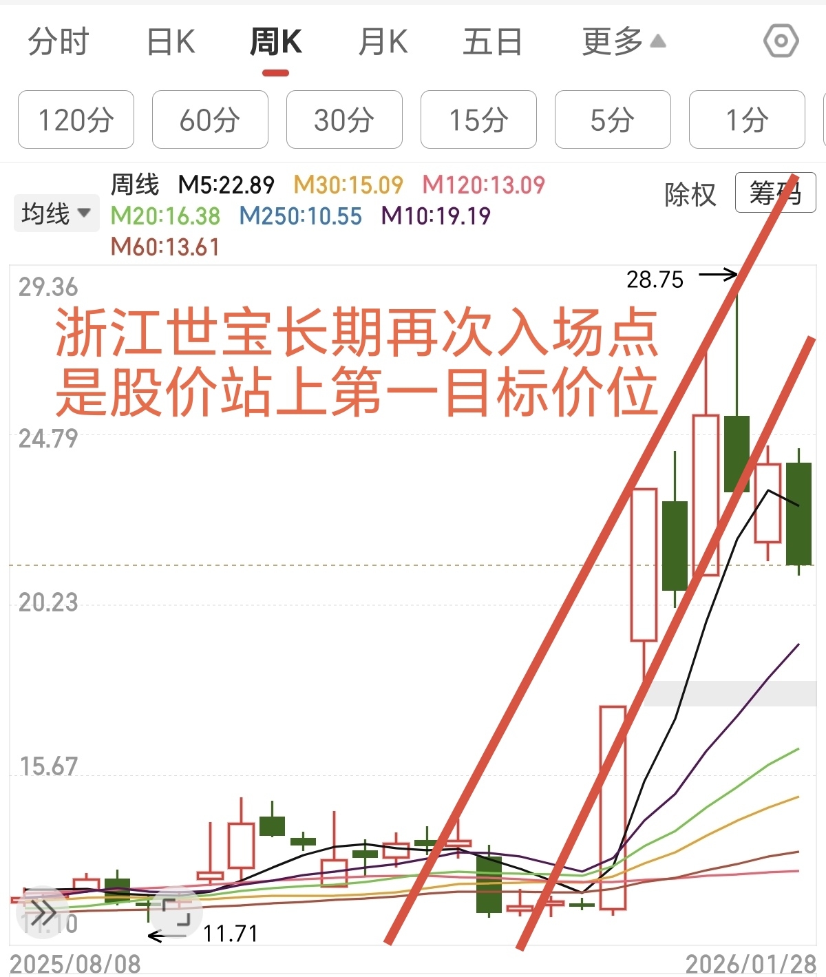 浙江世宝第一目标价位28.7 波动上沿30.8 波动下沿26.45 由最高价28.75可知第一目标价位已经走完了,与目标价位仅相差5分钱!波动上沿可以理解为惯性冲高,可到可不到,因为走的是月线级别的上涨,这么一调整时间或比较长,目前浙江世宝已经跌破了26.45 的波动下沿,那么就大概率考验周线下方的缺口,短线不易入场,再次说一下我一贯的思想,不要追高,因为大部分朋友不知道理论涨幅,一旦被套难免陷入追涨杀跌的循环!