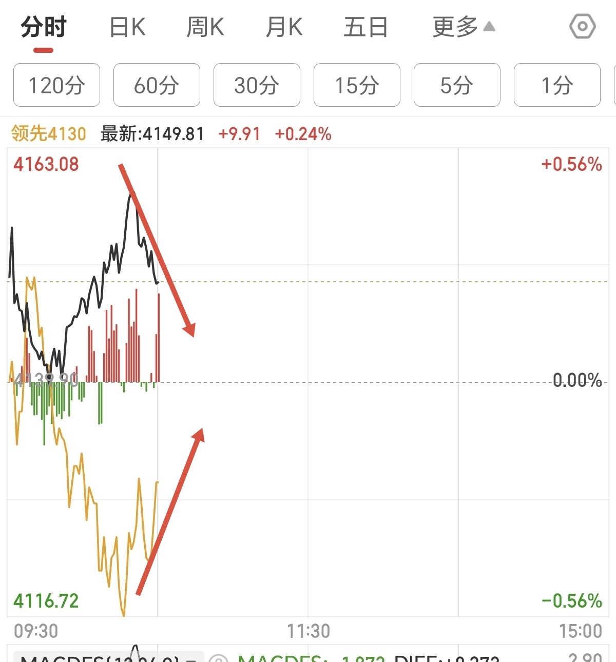中午收盘简单聊一下大盘走势,大家看一下下面两张分时图,可以清晰的看出权重股与中小盘个股连续背离,如果朋友清楚本论中量能与情绪面的关系就很好理解这种背离情况,权重股可以看做量能的体现,中小盘个股代表情绪面,情绪反应在股价,对标待涨家数,情绪后于量能见底,也可以理解为资金流动,反复切换,本次牛市难度之大超乎想象,所以不能用短期热点来衡量难与易!下一个日线级别阶段目标点位4420 波动上沿4480 波动下沿4358 春节之前有一定概率到达,起码我认为可以摸一下波动下沿4358点!牛市大盘第一目标点位5120点 波动上沿5325点 波动下沿4900点!大家共同见证!