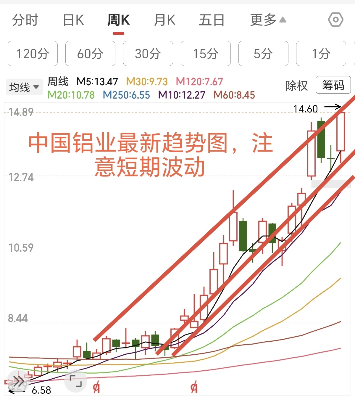 中国铝业再创新高,正好是第一目标价位波动上沿位置,那么到位了,我再来与大家分享一下第二目标价位,我们一起见证“本论”的科学精准性!