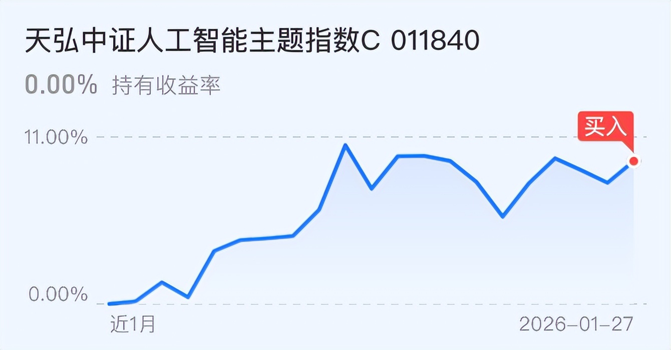 人工智能:2026 年是 AI 应用落地爆发元年,行业彻底告别概念炒作,进入业绩兑现阶段。AI 营销、AI 制药、企业级智能助手等场景商业化提速,广告主预算迁移、药企研发成本大幅下降,盈利确定性持续走高。同时算力基建持续扩容,上游硬件需求同步增长。该基金紧密跟踪人工智能指数,覆盖全产业链核心标的,一键布局 AI 产业红利。 昨天大龙是碳中和转的人工智能,但因为碳中和带有港股,所以是算今天买入的,大龙今天重新加仓,大龙今天加仓5万天弘人工智能,把握 AI 从技术渗透到盈利爆发的长期成长机遇。