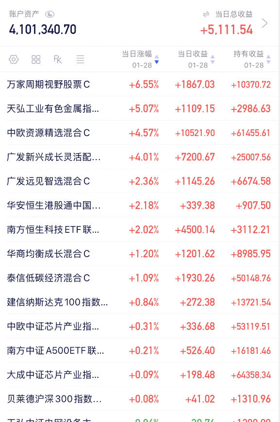 大龙要提醒高位,临近月末行情总体还是震荡,短期行情不太稳定,大龙是有加有减为主,减仓的等会下一个帖子2.30发,短期A股还是震荡,大龙继续加一些长期看好的方向,稳中求进!大龙今日加仓天弘人工智能、平安光伏、南方有色、中欧资源、万家周期、万家健康,今日总计加仓9万,减仓0万。