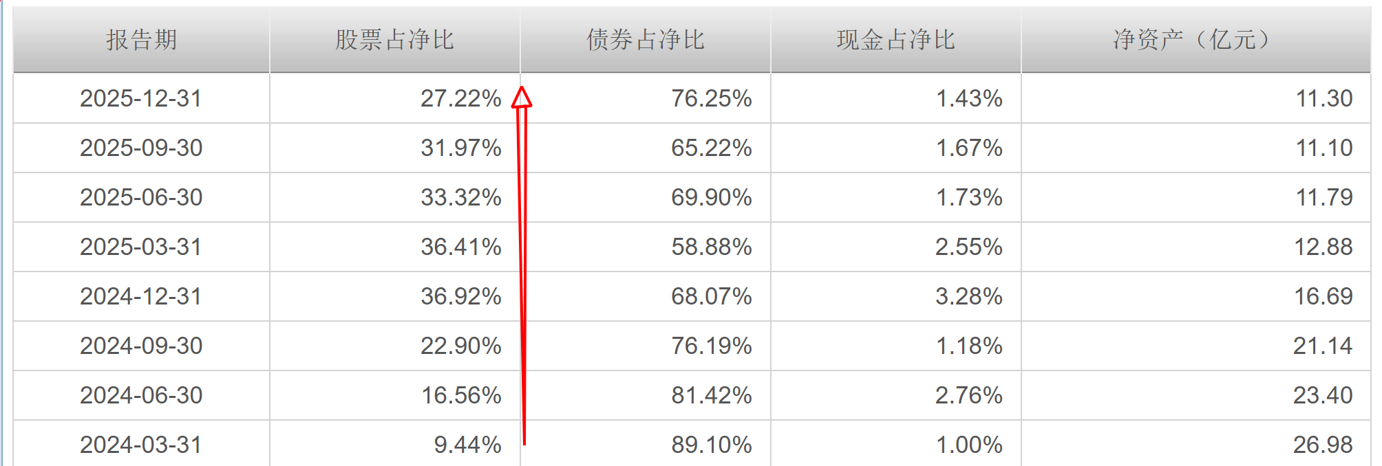 二、招商瑞信稳健配置近一年涨幅10%,从基金经理的持仓来看,当市场有机会的时候,我们发现,这个基金动态管理效果很好,市场低位的时候,像2024年9月,权益仓位逐渐在加大,现在市场涨那么多了,权益仓位慢慢在降,这就动态帮助投资者实现了收益落袋。