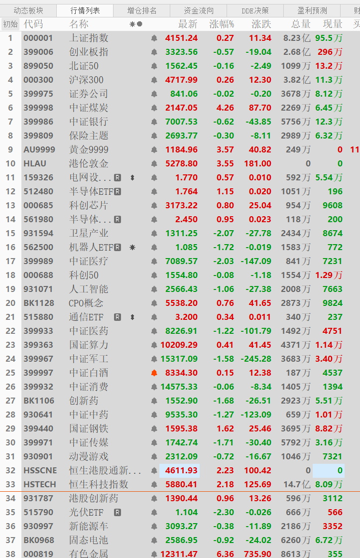 周三两市高开后维持震荡走势,截止收盘,盘面上黄金白银、有色资源、煤炭、港股恒生科技、半导体芯片等上涨,机器人、卫星、消费、创新药、新能源车光伏电池等下跌,两市跌多涨少,赚钱效应还行。