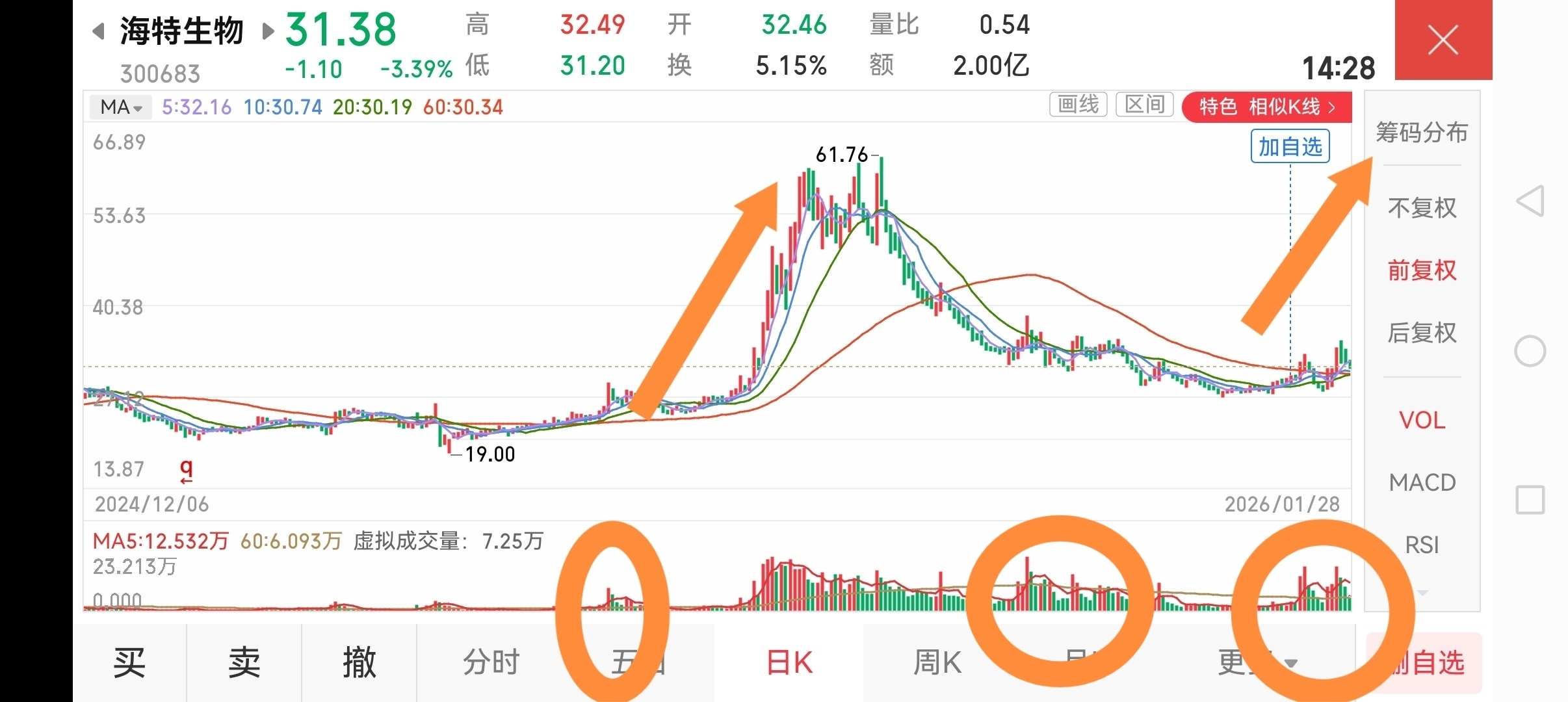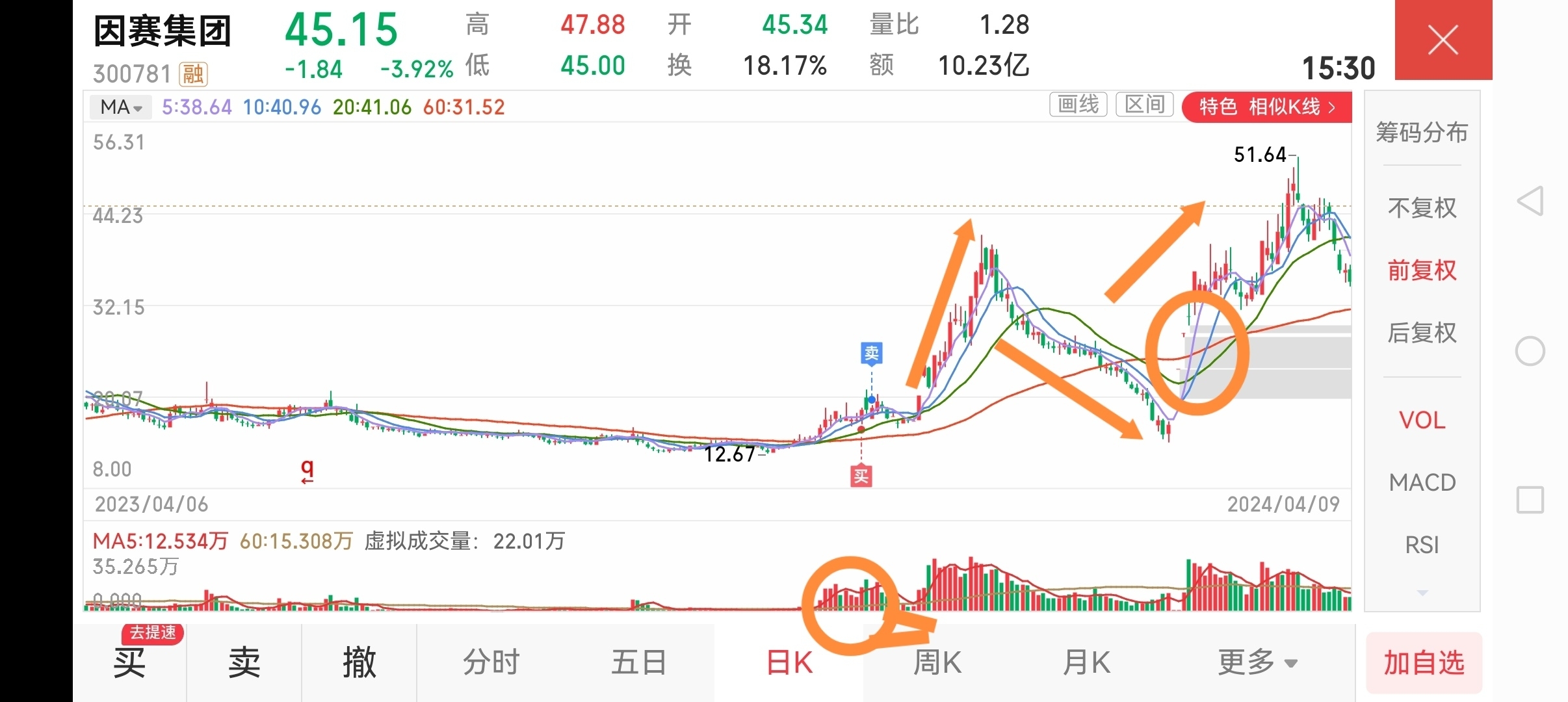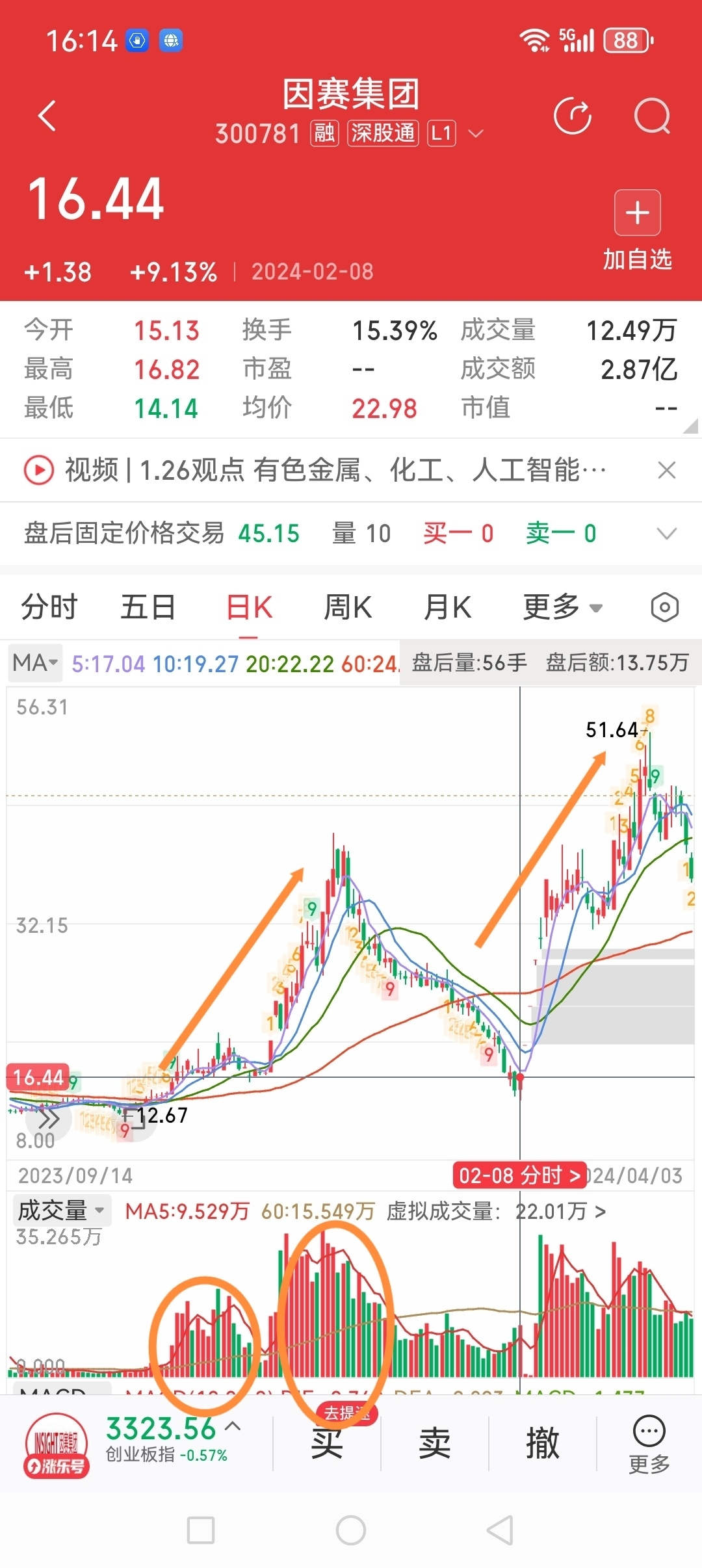 我不知道这些“高手”看盘有没有结合前后的量能和股票的位置看?不得而知。有次我买因赛集团,就是在底部60天均线附近放量时跟进的,就因为没有耐心持股,虽然买到底部放量的好股,但只拿一两天,赚一点皮毛就跑了,错过了快速翻倍的机会。