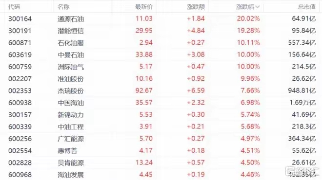 - 行情表现:通源石油、潜能恒信20cm涨停,石化油服、中曼石油、洲际油气等多股涨停,板块整体涨幅居前。