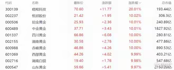 - 行情表现:板块集体爆发,晓程科技、恒邦股份、招金黄金、中金黄金、四川黄金、湖南黄金、赤峰黄金、西部黄金等多股涨停,湖南白银、山东黄金大涨近10%。