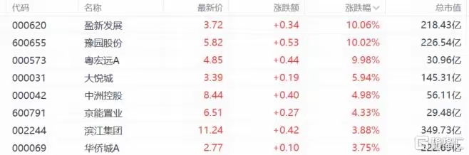 - 行情表现:板块内盈新发展、豫园股份、粤宏远A涨停,大悦城大涨近6%,整体领涨市场。