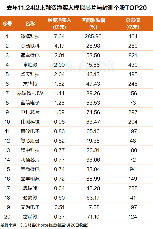 东方财富Choice数据显示,自去年11月24日半导体指数阶段性见底上行以来,杠杆资金抢筹了一批模拟芯片与封测概念股。