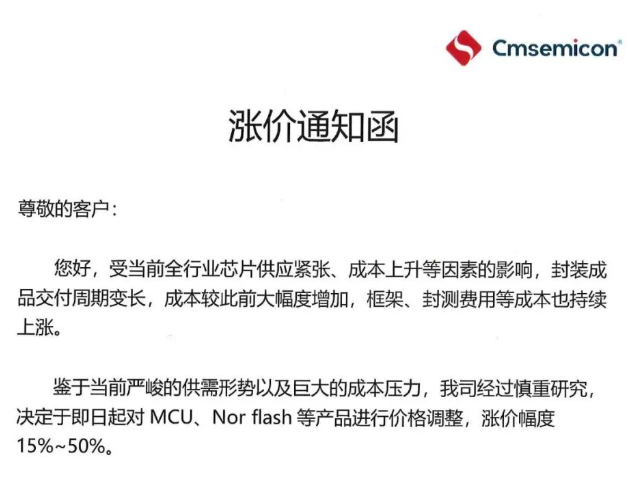 A股上市公司中微半导周二(1月27日)发布涨价通知函称,受当前全行业芯片供应紧张、成本上升等因素的影响,封装成品交付周期变长,成本较此前大幅度增加,框架、封测费用等成本也持续上涨。公司经过慎重研究,决定于即日起对MCU、Nor flash等产品进行价格调整,涨价幅度为15%—50%。