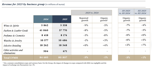 但相比2024年,LVMH旗下两大板块仍有所下滑,葡萄酒部门和时装皮具部门的营收在有机口径下均下滑了5%;腕表珠宝与精选零售则分别上涨3%和4%;香化部门持平。