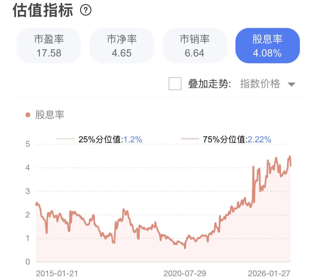 股息率则来到了历史极高位置,最新股息率高达4.08%,和红利指数一个级别了。