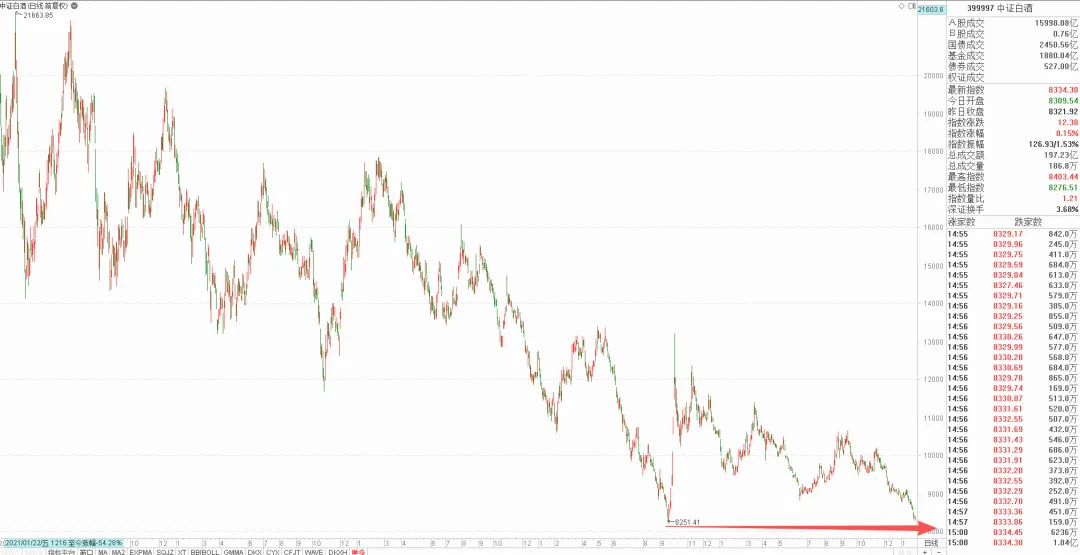 2024年9月A股熊转牛的拐点之际,中证白酒指数(399997.SZ)最低到8251.4,到现在牛市走了1年多了,中证白酒的最新价为8334.3,累计仅涨1.0%,假如接下来稍微再跌一跌,白酒就要在牛市里创新低了。