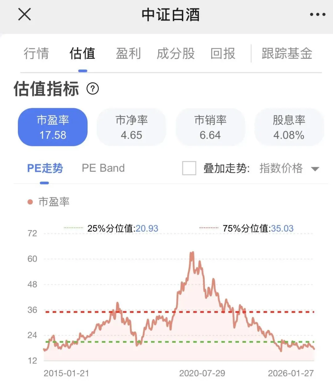 相应地,白酒的估值也来到了历史极低区域,下图是中证白酒的市盈率PE走势,最新PE为17.58,处在近10年的最低位。