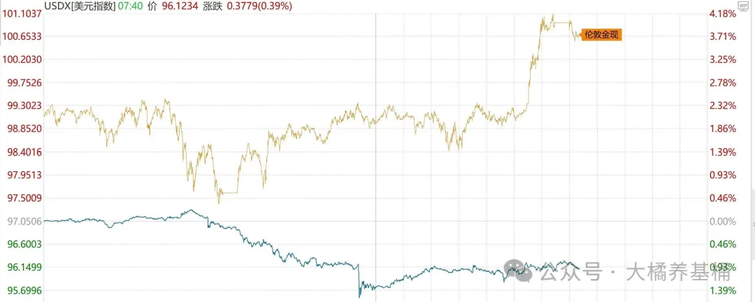 受此影响,美元指数应声跳水,最低触及95.73,创下本轮行情新低,黄金随之大涨。