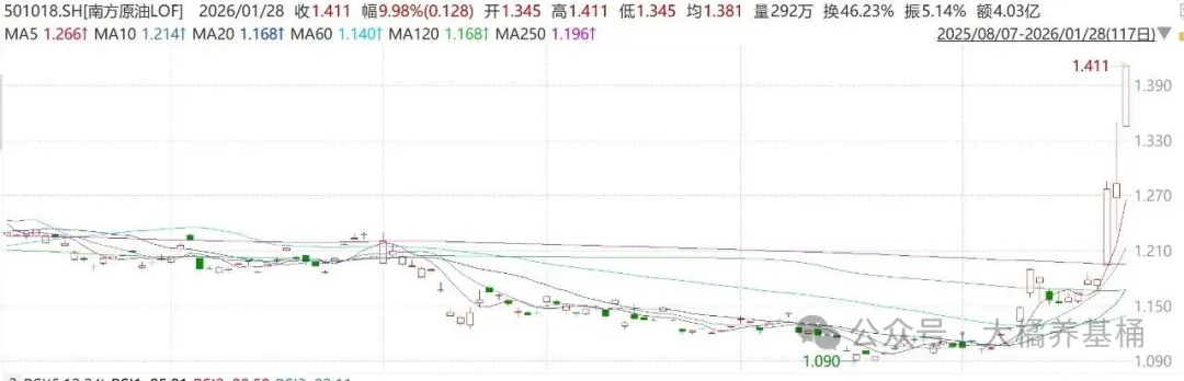 第2,再看下散户情绪,白银LOF已经暂停申购,不能满足大家套利的需求,于是又开始嚯嚯原油LOF去了,因为刚好商品原油近期有所表现。当前原油LOF的场内溢价已经接近30%,1月7日以来场内涨幅达到了27%,近期是追踪散户情绪的指标之一。