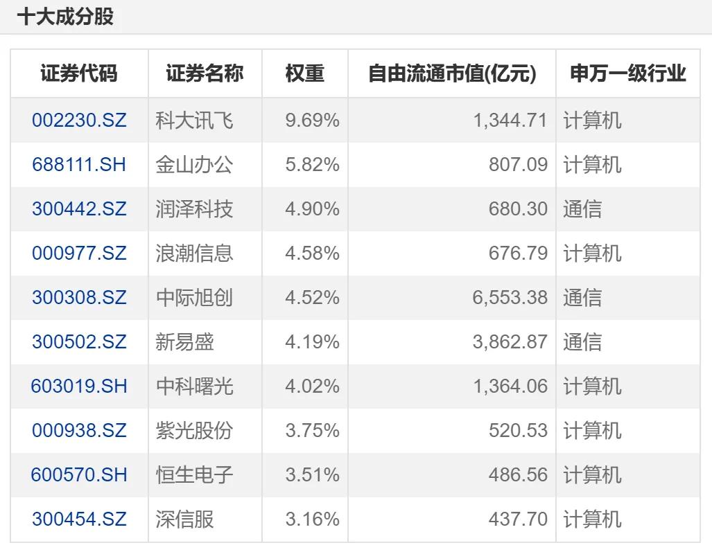 云计算ETF(159890)跟踪的是中证云计算与大数据主题指数,包含了计算机软件、云服务、计算机设备、通信设备等环节,前十大成分股除了科大讯飞、金山办公等软件龙头之外,还有中际旭创、新易盛等通讯龙头,对AI应用和信创方向都进行了覆盖,范围更广。