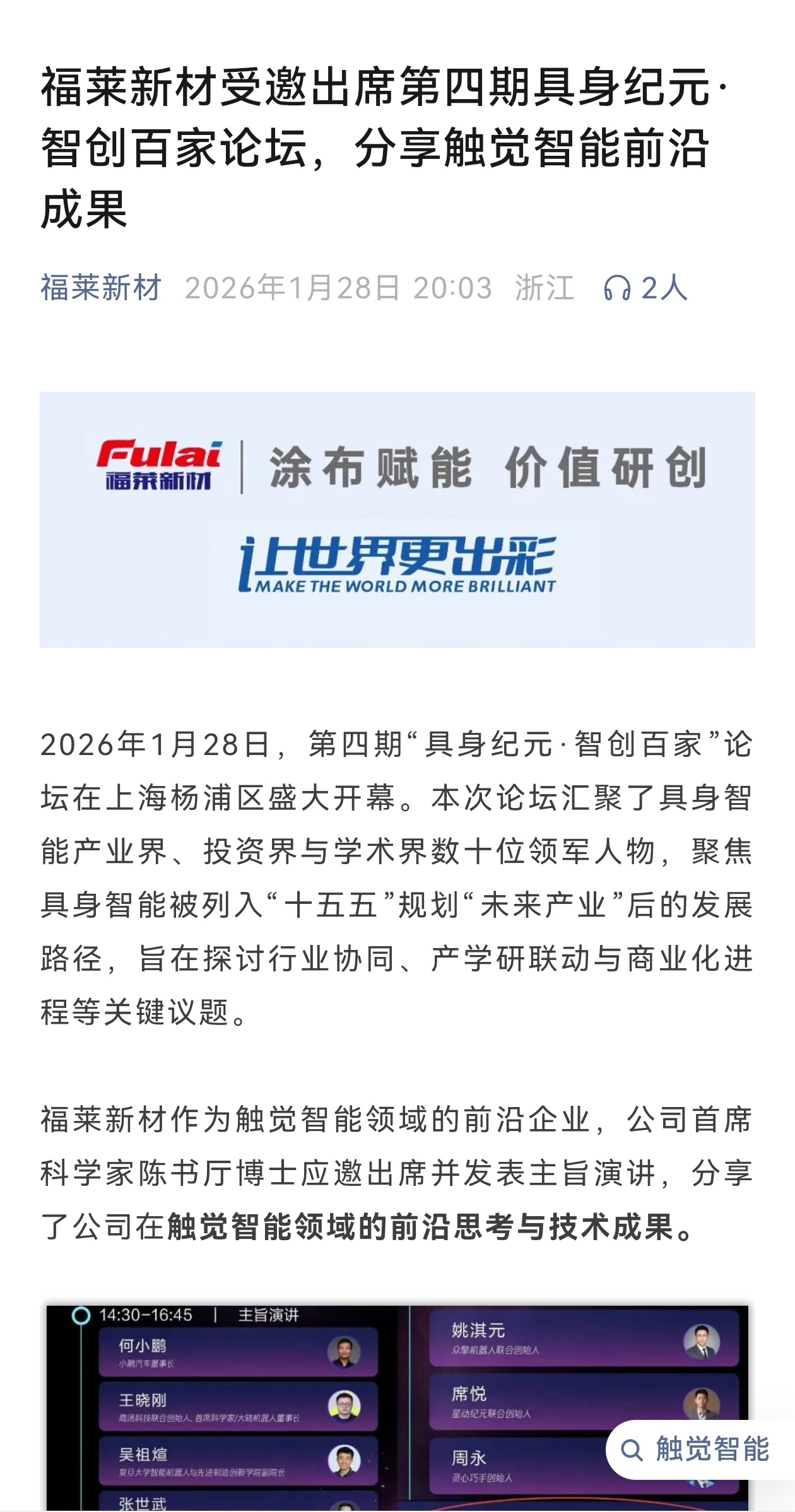 $福莱新材(SH605488)$ 2026年1月28日,第四期“具身纪元·智创百家”论坛在上海杨浦区盛大开幕。本次论坛汇聚了具身智能产业界、投资界与学术界数十位领军人物,聚焦具身智能被列入“十五五”规划“未来产业”后的发展路径,旨在探讨行业协同、产学研联动与商业化进程等关键议题。