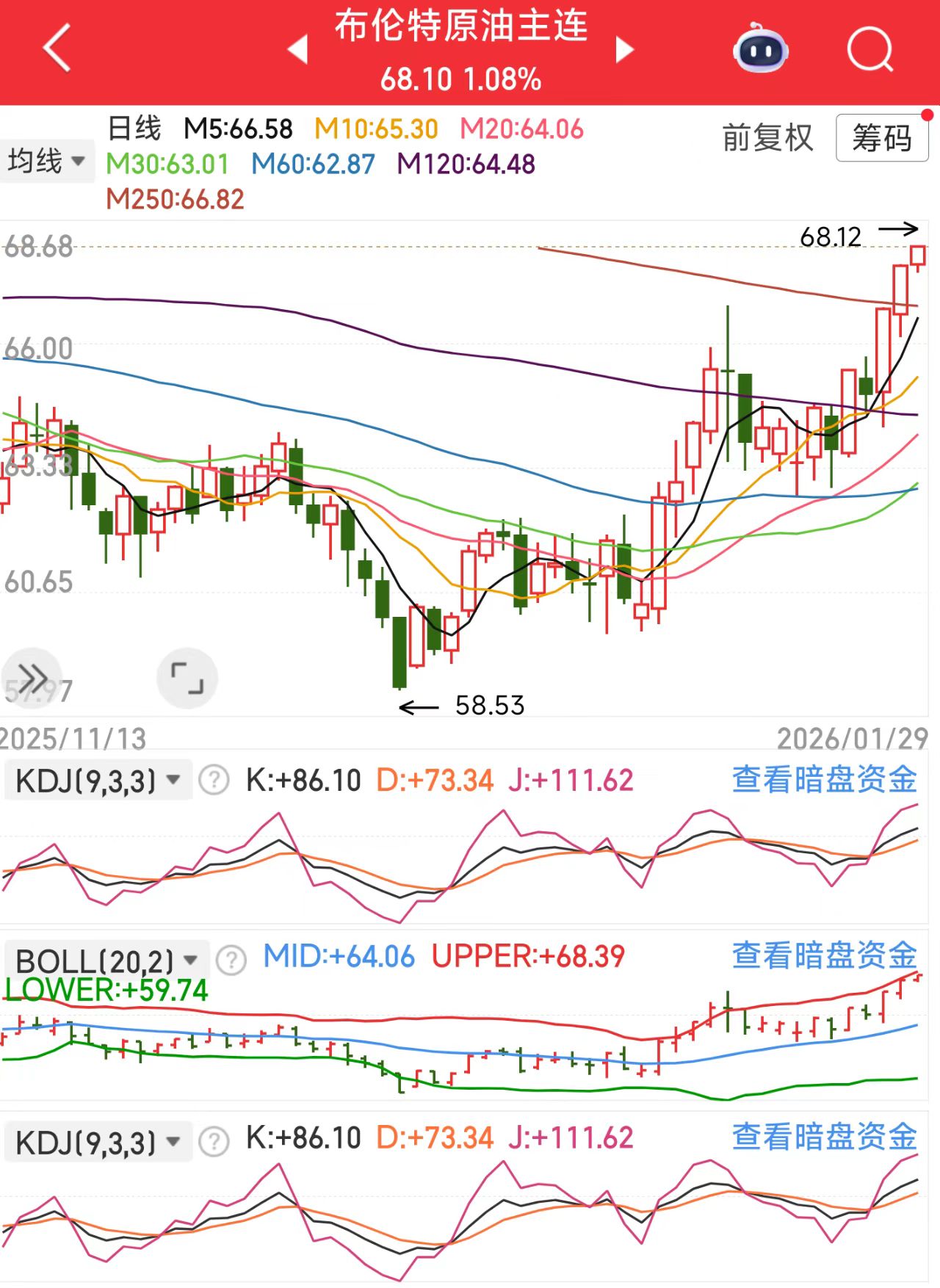从技术面看,油价近期呈现震荡上行走势,均线系统维持多头排列,MACD红柱扩张显示上涨动能未衰,但需警惕KDJ指标进入超买区,暗示短期存在技术性回调需求,如同紧绷的弹簧终需释放压力。