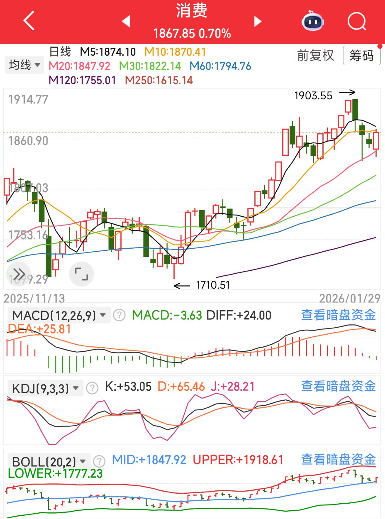技术面看,消费指数近期进入震荡调整期,短期均线拐头向下,股价承压于关键支撑位,MACD动能柱收缩显示上涨乏力,虽然整体趋势尚未扭转,但KDJ指标高位死叉暗示调整或未结束,市场正消化前期涨幅,短期或延续震荡格局。