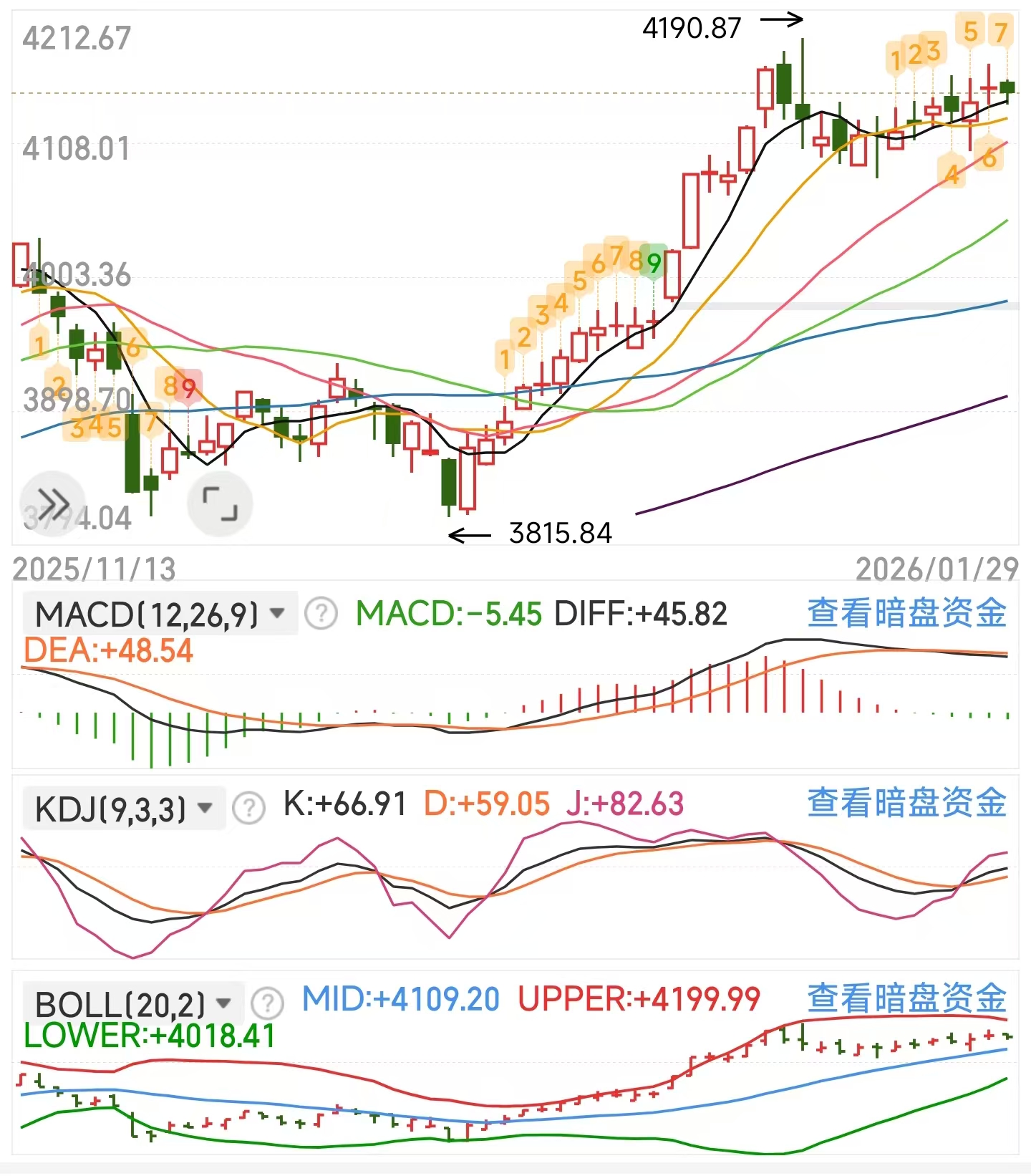·分析:中期看指数选择了向上走,各项指标线也都处于上沿位置,上方压力还是比较大的,不过也不用担心指数触顶跌下去,下面的支撑也是很强的。