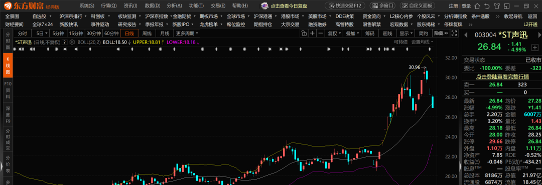 ST声讯:在突破前高后走出一个双顶形态,今日跌停回踩布林带中轨,如若后续在23-26区间得到量能支撑,阿吉会适当接回,博弈行情反弹