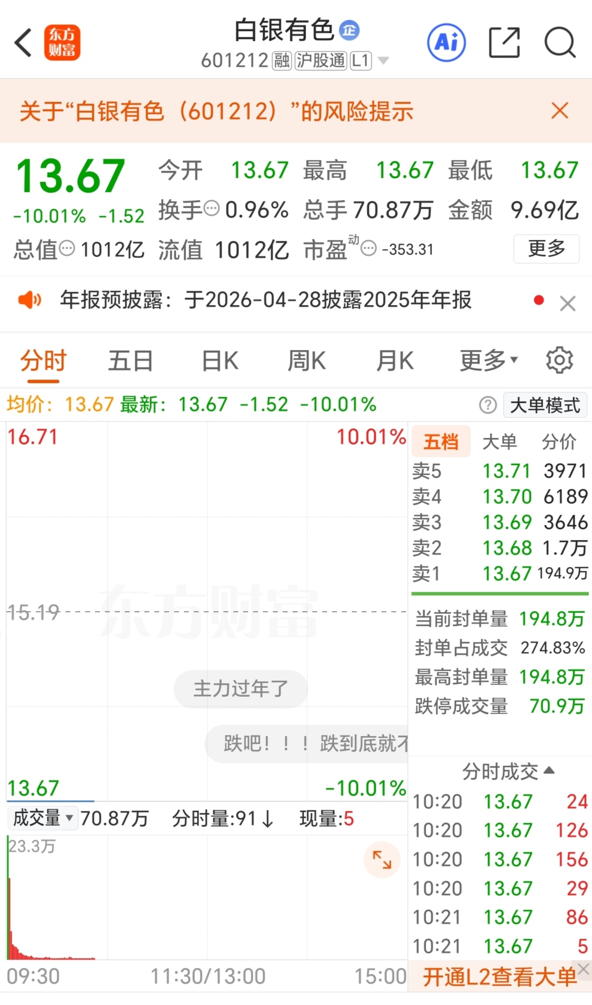 1月30日早盘,A股市场迎来惊魂一刻!贵金属龙头白银有色(601212)以一字跌停开盘,9:25分即被1.64亿股卖单死死封在跌停板上,封单金额高达22.43亿,全天成交额定格9.22亿,6747万手筹码在跌停板上挣扎。