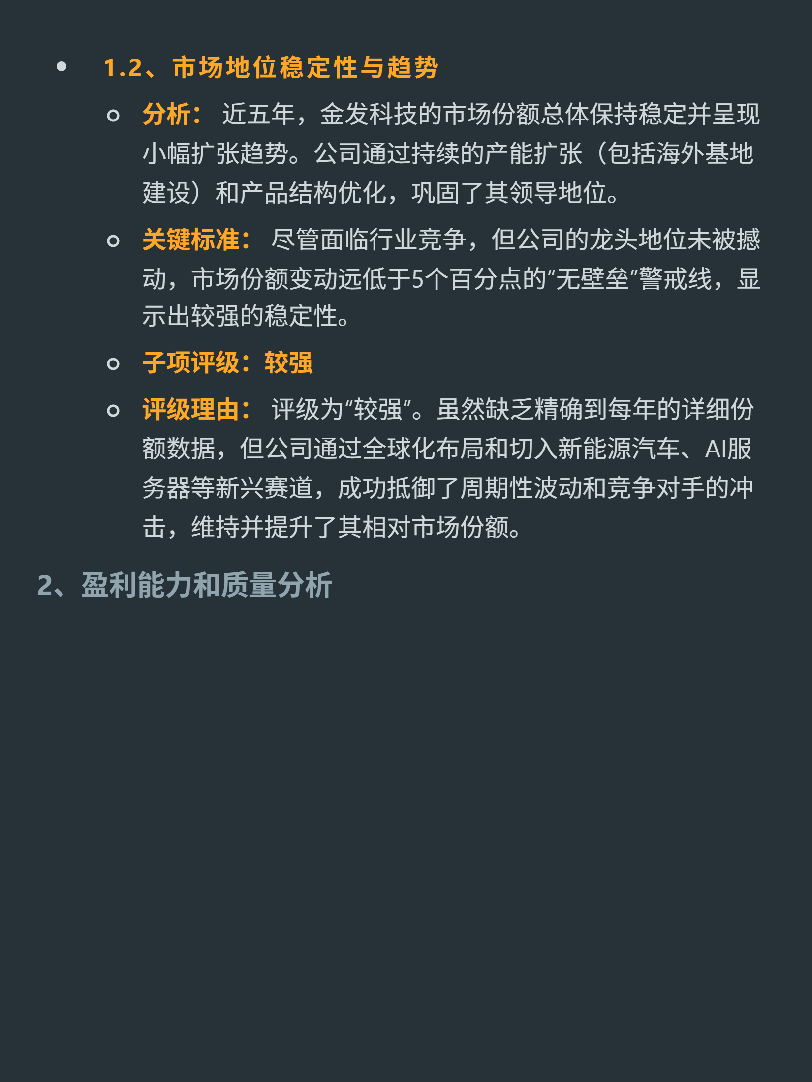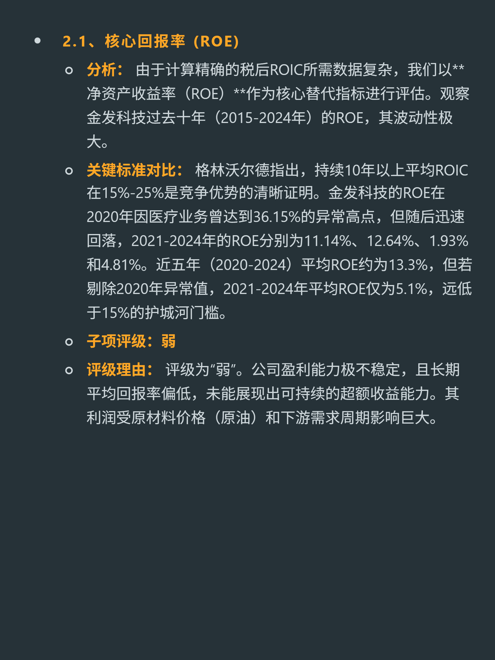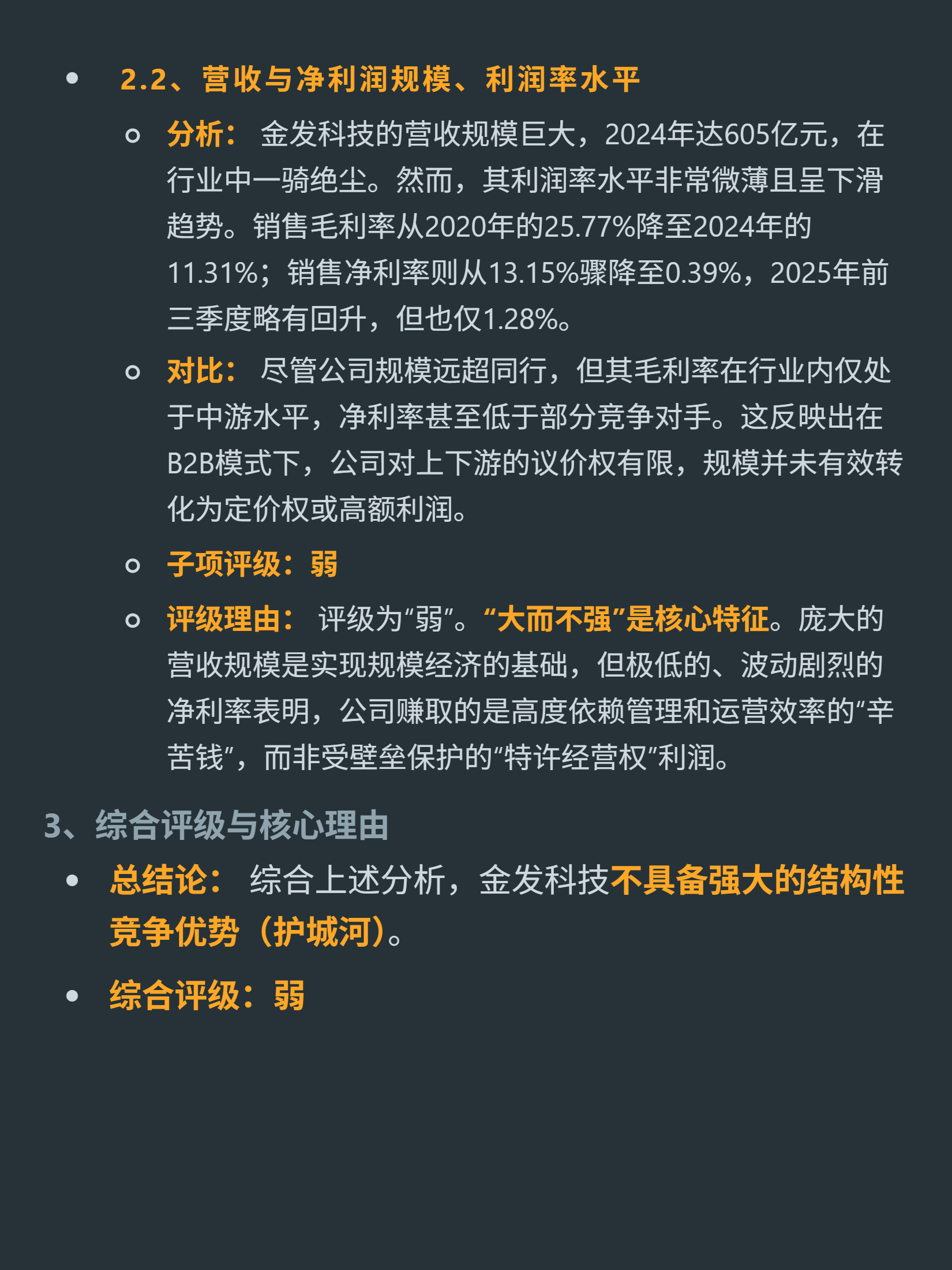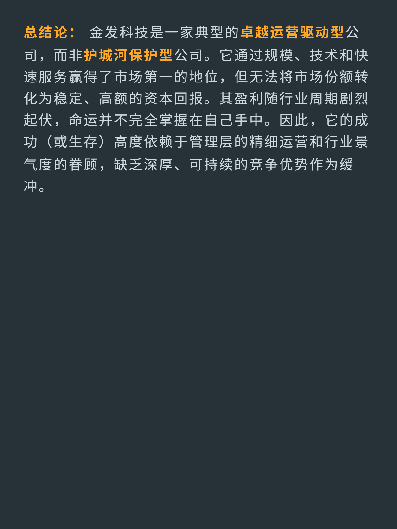 总结:金发是卓越运营驱动的公司,靠规模、技术和快速服务占市场第一,但无法将份额转化为稳定高回报,成功高度依赖管理层精细运营和行业景气,缺乏可持续的竞争优势(护城河)。