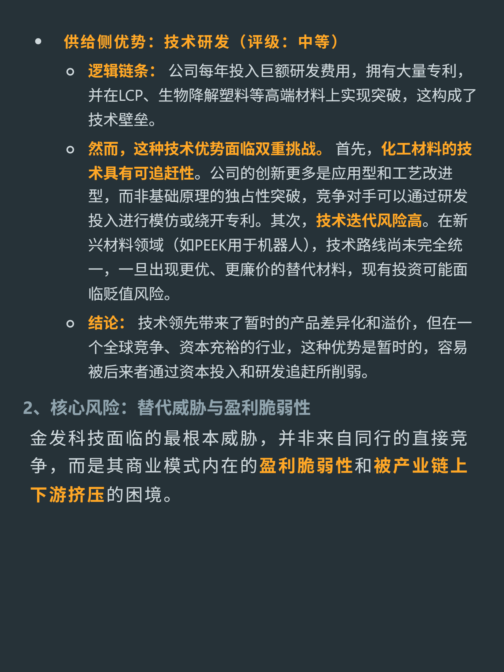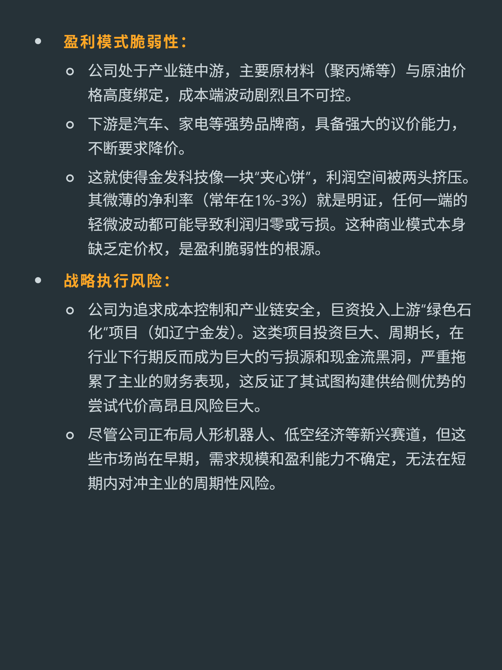 竞争优势与风险:规模和技术是“虚假优势”——规模大但客户粘性弱,新进入者可低价抢单;技术为应用型改进,易被同行研发追赶;盈利受原材料(原油)和下游客户压价双重挤压,是“夹心饼”型利润;布局上游石化和新兴赛道(如机器人材料),但投资大、周期长,短期难对冲周期风险。