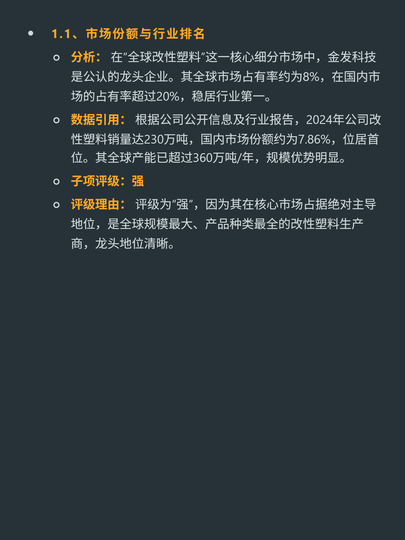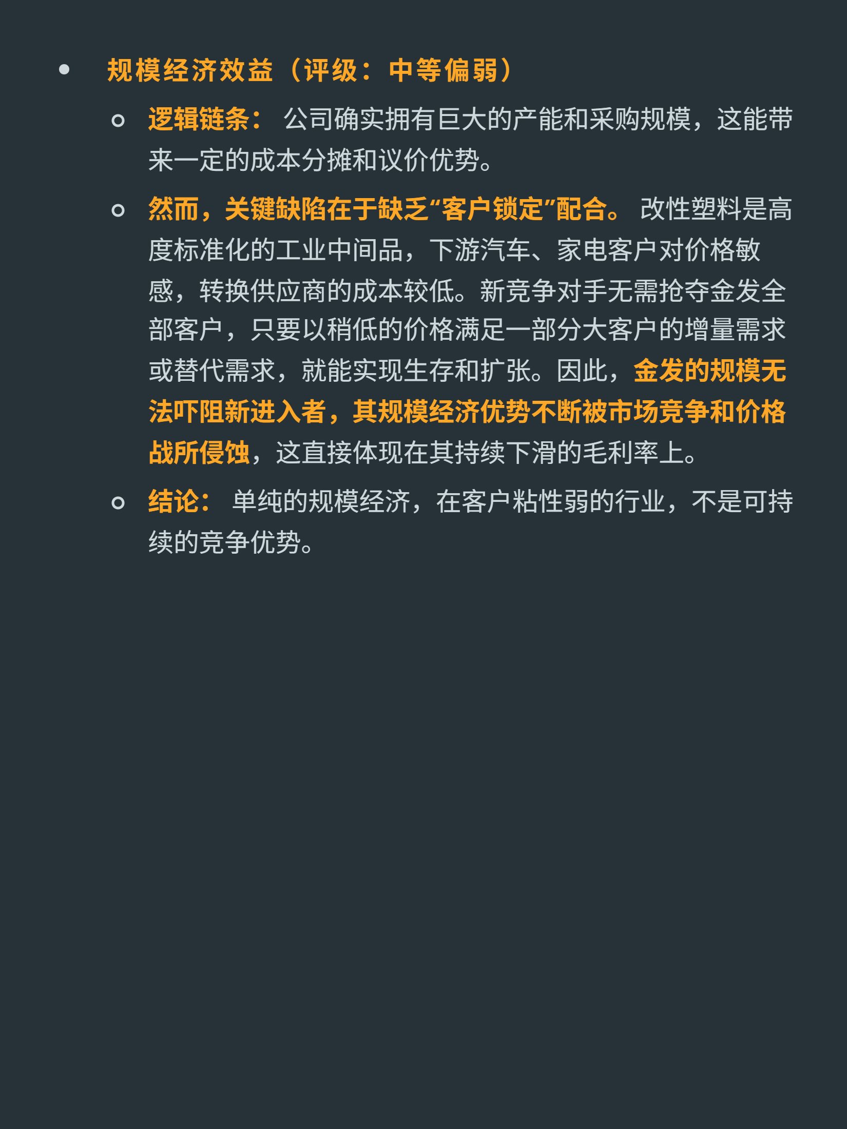$金发科技(SH600143)$$万华化学(SH600309)$$恒力石化(SH600346)$研究金发科技,最核心的发现是:它是全球改性塑料龙头,却没建立起可持续的竞争优势(护城河)。