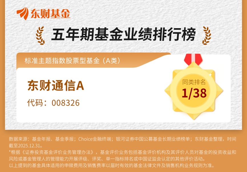 2025年,东财基金诞生了第一只年内业绩“翻倍基”——东财通信。2025年,东财通信A的收益率达到109.1%(*同期业绩比较基准表现102.6%)。当把时间维度拉长至5年,我们仍然可以发现,成立于2020年的东财通信A登上了银河证券中国公募基金长期业绩榜单五年期业绩的同类(标准主题指数股票型基金A类)榜首。