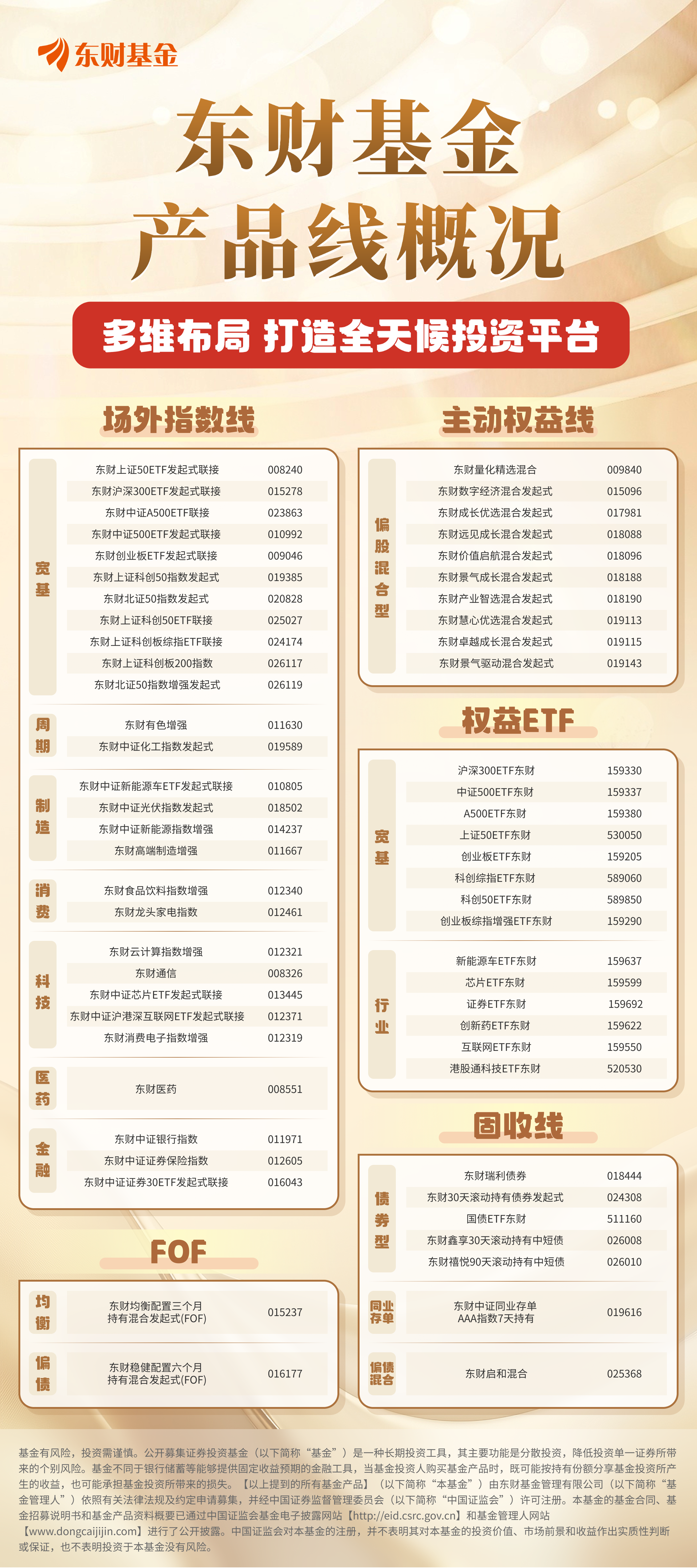本资料为宣传资料,不作为任何法律文件。本基金管理人承诺以诚实信用、勤勉尽责的原则管理和运用基金资产,但不保证本基金一定盈利,也不保证最低收益。本基金的过往业绩及其净值高低并不预示其未来业绩表现,基金管理人管理的其他基金的业绩并不构成对本基金业绩表现的保证。东财基金提醒您基金投资的“买者自负”原则,在做出投资决策后,基金运营状况与基金净值变化引致的投资风险,由您自行负担。基金管理人、基金托管人、基金销售机构及相关机构不对基金投资收益做出任何承诺或保证。投资有风险,投资前请仔细阅读本基金的基金合同、招募说明书和基金产品资料概要。以上信息仅供参考,如需购买相关基金产品,请您关注投资者适当性管理相关规定,提前做好风险测评,并根据您自身的风险承受能力购买与之相匹配的风险等级的基金产品。