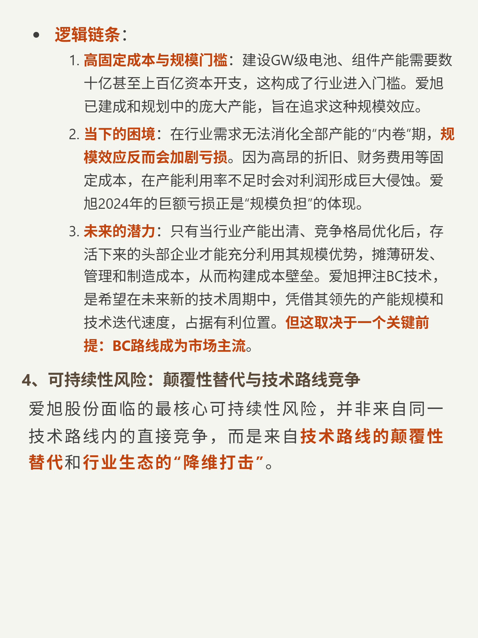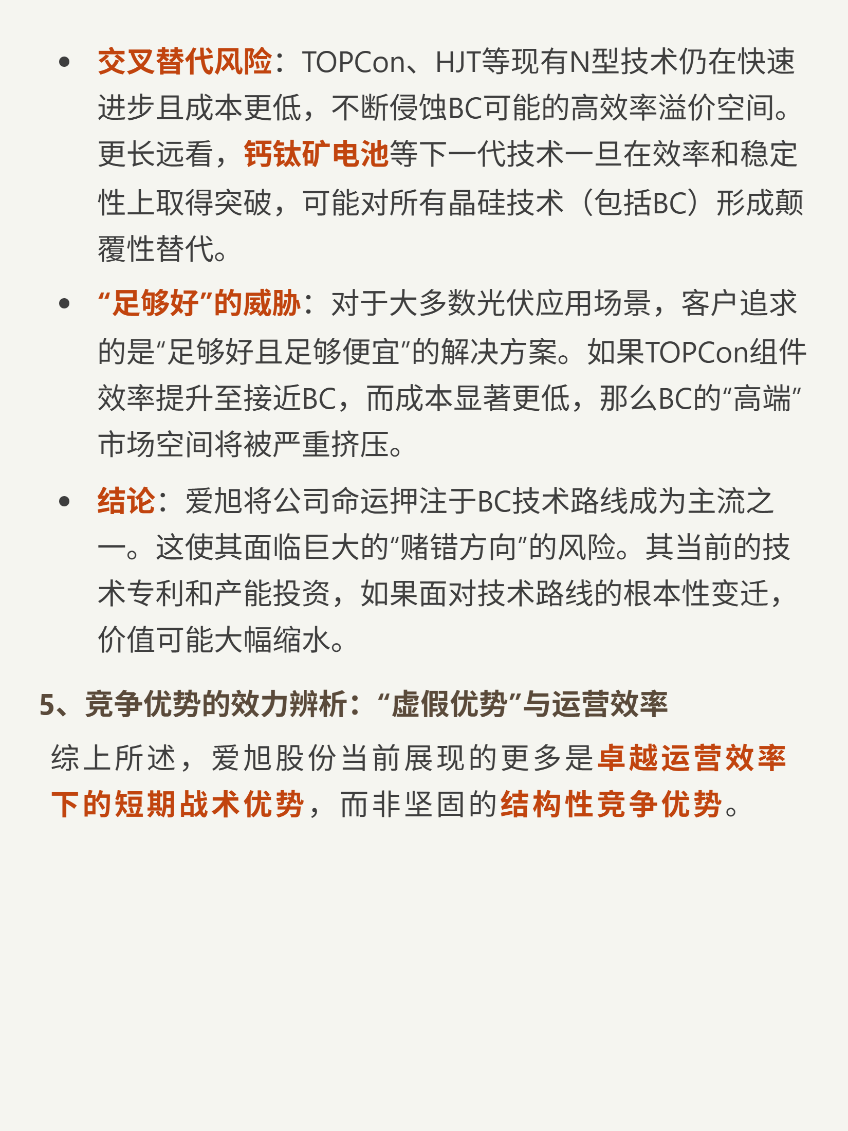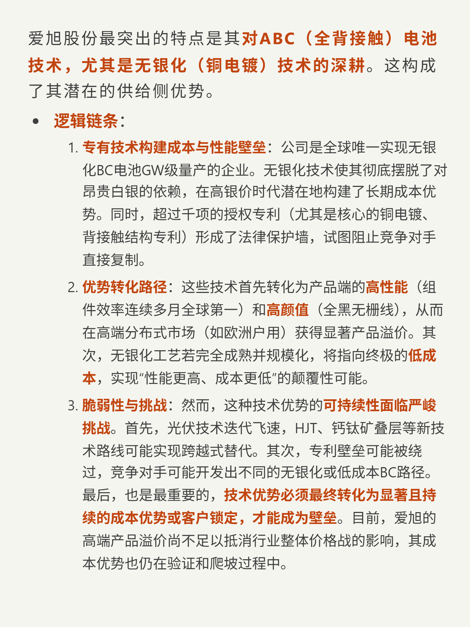 技术与风险:全球唯一ABC无银化GW级量产,千项专利,但光伏技术迭代快(TOPCon、钙钛矿威胁),专利易被绕过;规模当前是负担,需BC成主流才可能转化为优势。