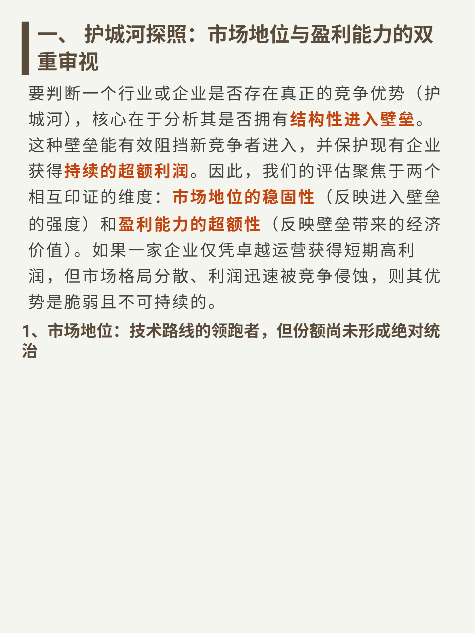 以上是公司护城河是否存在、竞争优势来源于可持续性分析。完整报告里还有它的主要竞争对手对比,竞争优势排名,以及护城河总结、优势、劣势、归因以及对投资者的启示。还有公司全面深度分析报告,判断是否好公司。打开【口袋分析师】小程序即可获得。