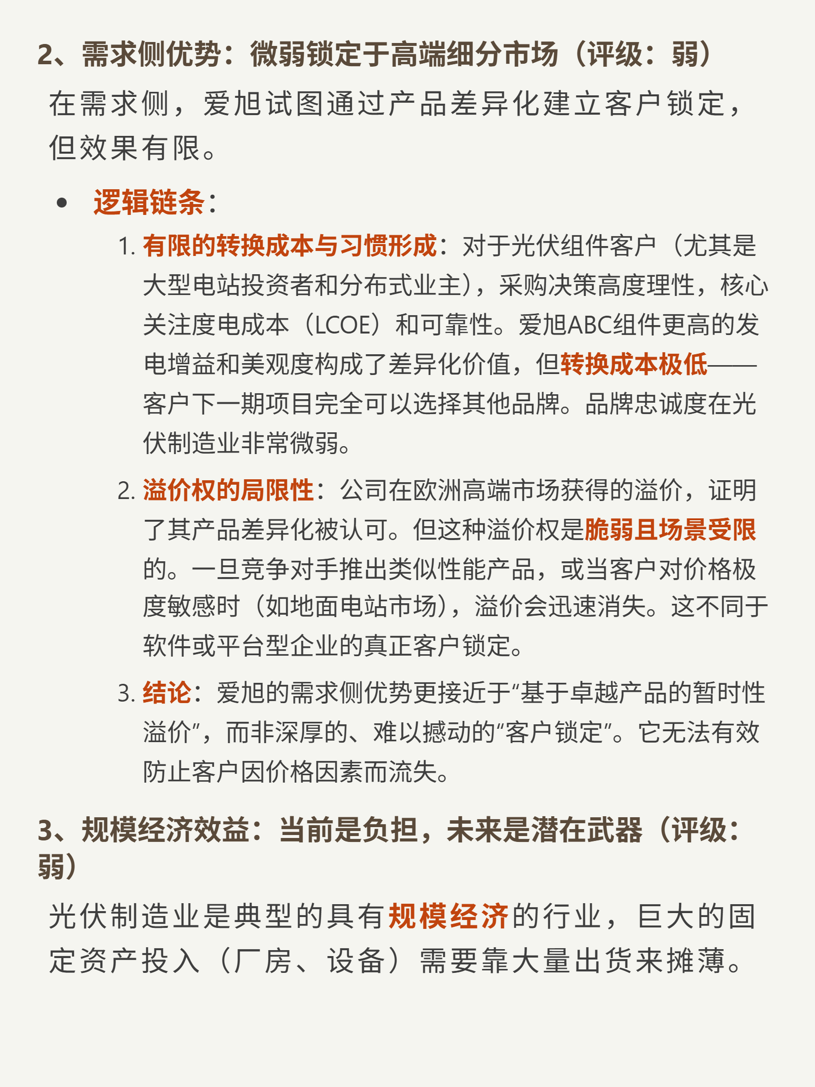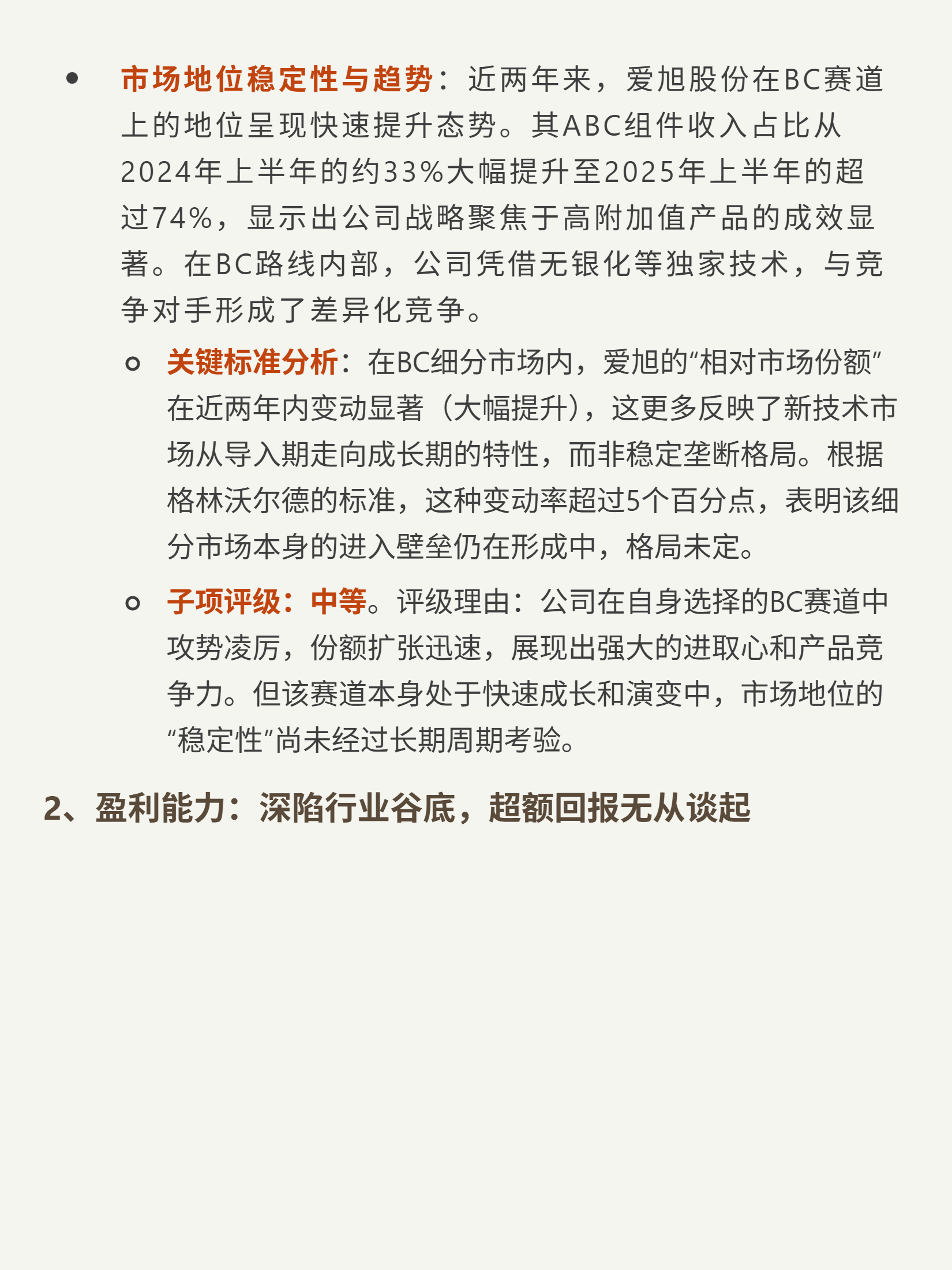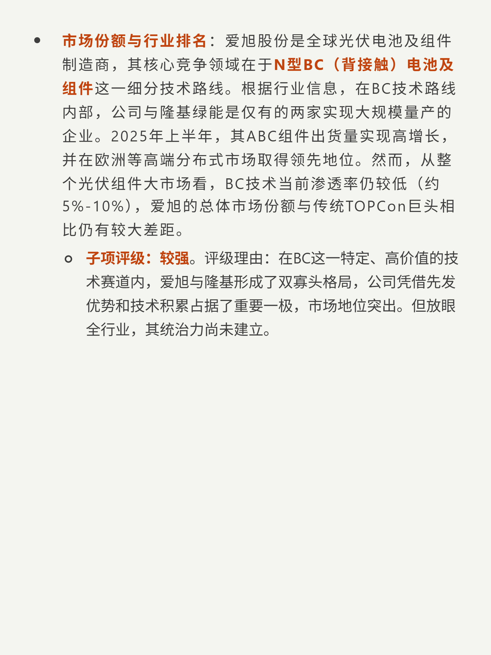 市场地位:BC技术内与隆基双寡头,2025上半年ABC组件出货高增长,欧洲高端市场领先,但全行业BC渗透率仅5%-10%,总体份额远低于TOPCon巨头;份额提升靠技术押注和执行,非壁垒保护。