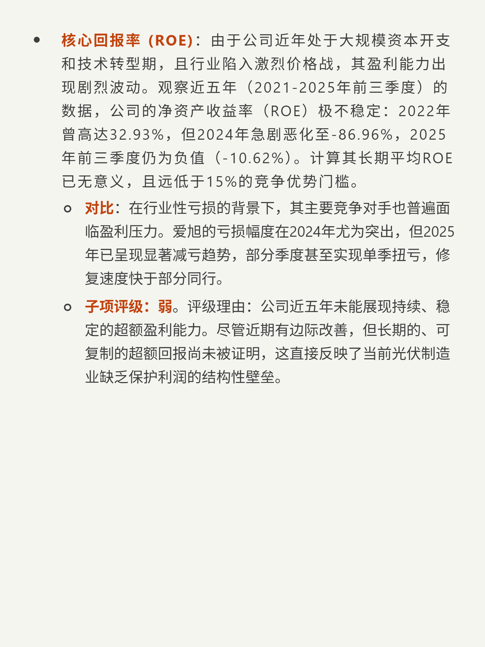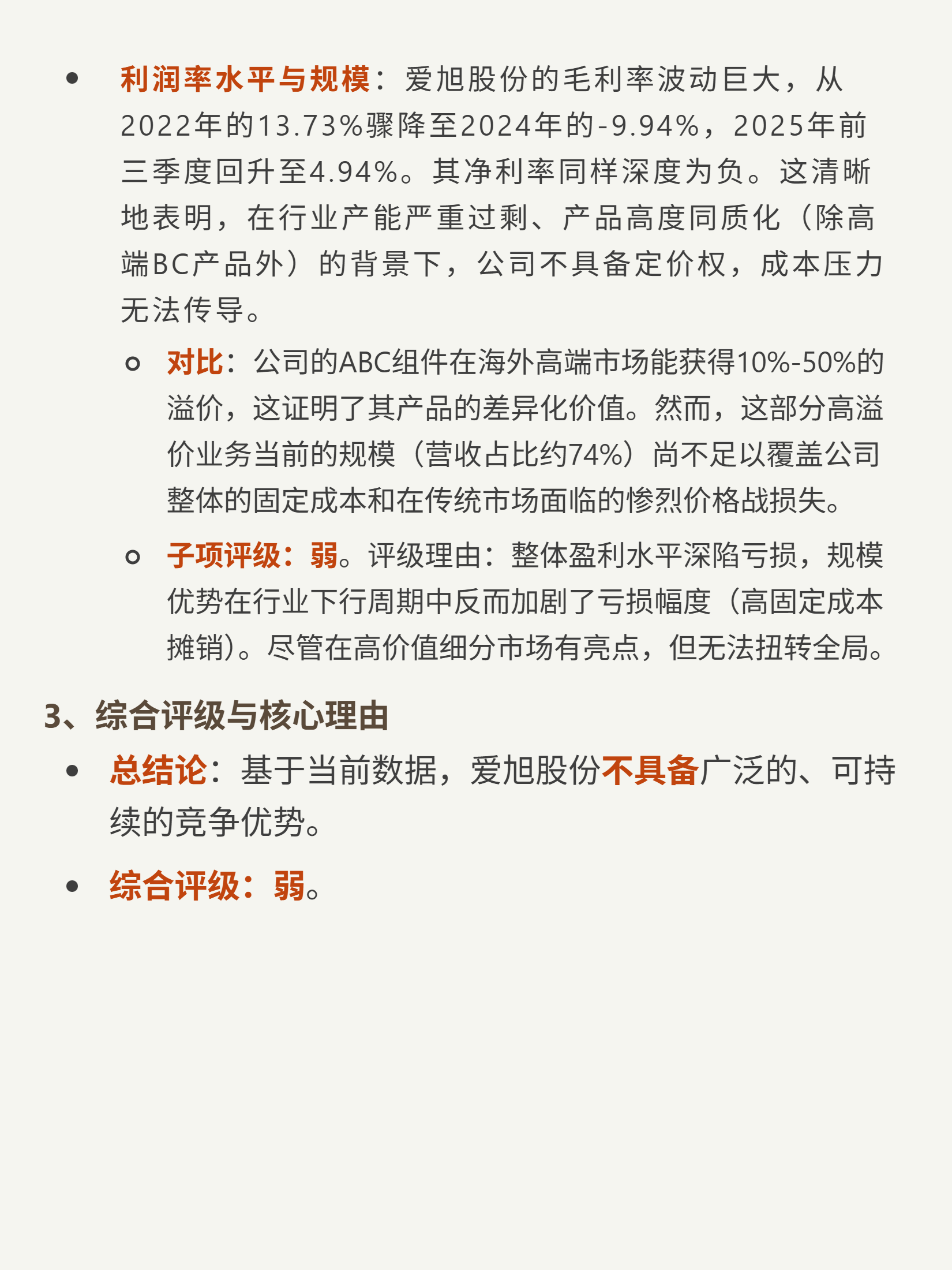 总结:综合评级弱,无可持续竞争优势,靠运营效率(技术眼光、研发、量产能力)生存,赌BC路线成主流,胜负未卜。
