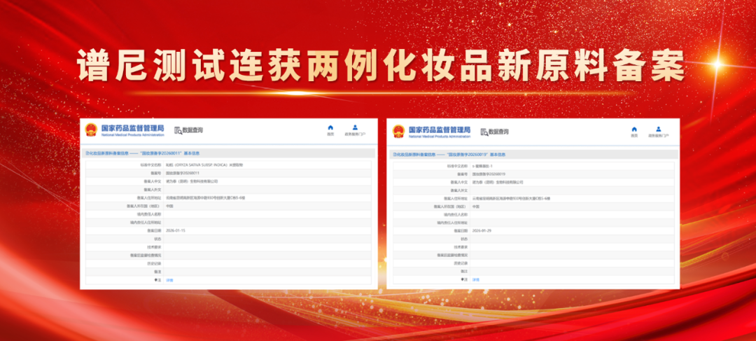 近日,由谱尼测试集团提供全链条技术支持的两款化妆品新原料——“s-蜜蜂寡肽-1”与“籼稻米提取物”,已成功通过国家药品监督管理局备案。两项成果的取得,再次体现了谱尼测试集团在化妆品新原料合规化领域的专业护航能力。
