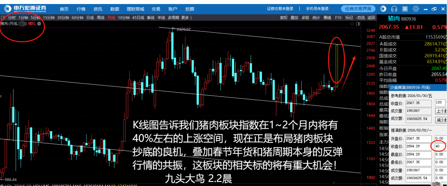 在接下来的马年“结构牛市”行情中,我预判:大科技、机器人、电池、光模块、航天军工、有色金属、资源类、AI 等板块即将迎来集体大调整。而在这种市场环境下,大消费板块即将迎来了崛起的契机。正所谓此消彼长!猪肉,作为大消费板块的一个重要分支,隶属于农林牧渔行业,在未来的市场中有望扮演重要的角色。