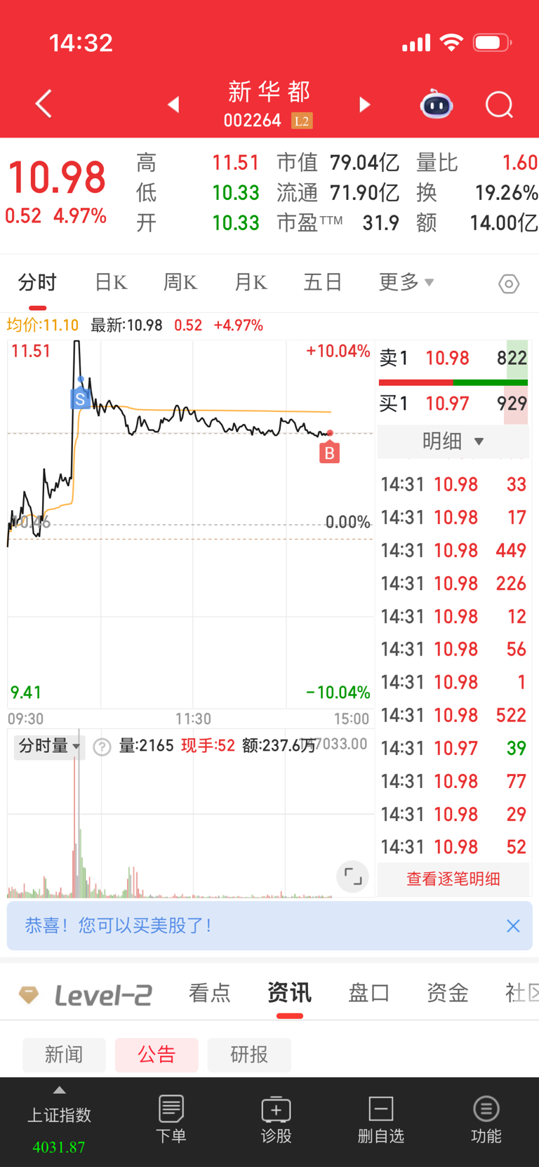 新华都:今天早盘封板又砸开,问题不大,还在走趋势,早上8个点附近抛了一半,尾盘又接回了,继续格局。