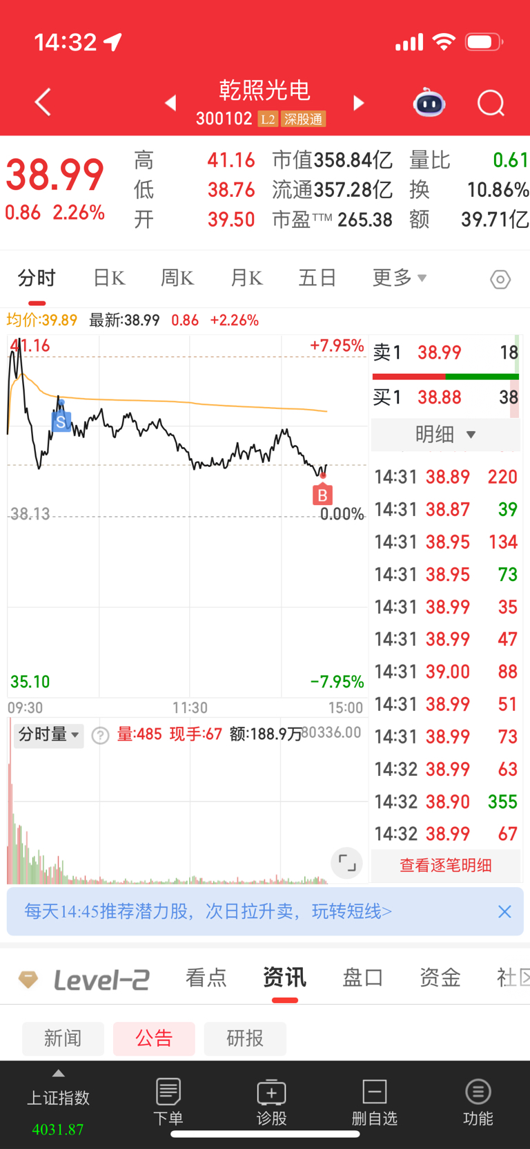 乾照光电:今天的走势没有预期那么强,主要是盘面拖累,早盘冲高减了仓位,尾盘回落接回,继续格局