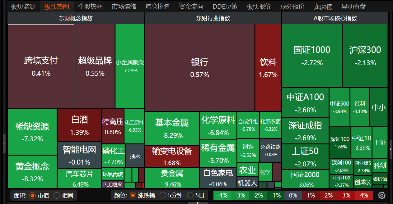 跌幅方面, 市场情绪快速降温, 资源股集体重挫, 贵金属、小金属等有色板块大面积走低,湖南白银、西部黄金、四川黄金等成分股大面积跌停;油气股低开低走,中曼石油、准油股份跌停;煤炭板块持续走弱,大有能源跌停;钢铁股震荡下行,中信特钢、柳钢股份等跌停;半导体产业链走低,存储芯片板块跌幅居前,兆易创新、万润科技、开普云等多股跌停;农药、化工股震荡下行,宏达股份、利尔化学等跌停。此外,房地产、风电设备、电池等板块表现不佳。