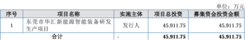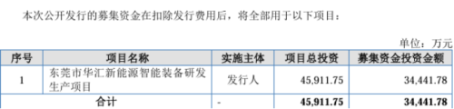 此次IPO,公司计划募集资金3.44亿元,全部用于东莞市华汇新能源智能装备研发生产项目。
