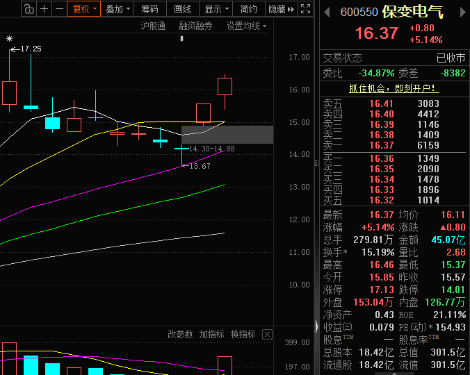 昨天收盘价为16.37,涨5.14%,成交额45.07亿、换手率 15.19%,主力净流出1.82 亿,分时高开回踩15.37后震荡上行,尾盘微落,日内承接有力但紫金有兑现迹象;日线连续阳线,5/10/20 日均线多头排列,短期强势延续但高位分歧显现,16.46是关键压力位,突破可上看 17.0,反之回调至15.8-16.0整固;中期多头格局稳固,15.37、14.8是重要支撑,跌破则节奏放缓,长期受益电网投紫,不过估值偏高,需要业绩支撑才能延续趋势。