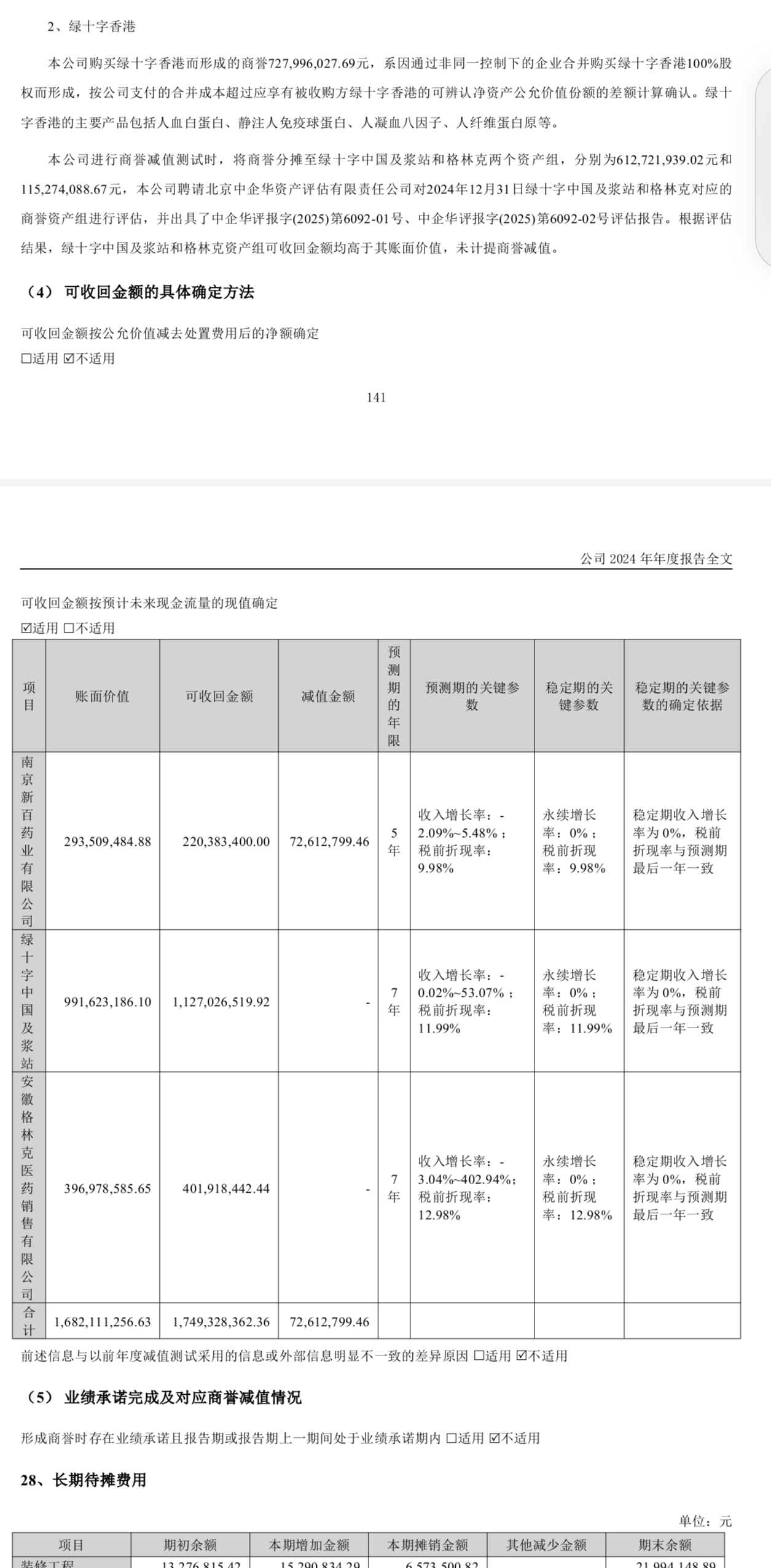 1、博雅生物进行商誉减值测试时,将商誉分摊至绿十字中国及浆站和格林克两个资产组,分别为6.12亿元和1.15亿元。